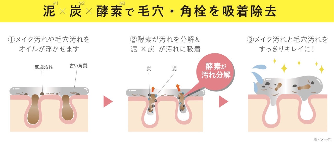 「クレージュ ポアクレイオイル ブラック」は、天然クレイ*¹(泥)と炭*²、酵素*³が配合されたトリプルパワー処方。まずオイルがメイクや毛穴汚れを浮かせます。その後、3種の酵素*³の力で汚れを分解し、天然クレイ*¹(泥)と炭*²が皮脂や頑固な黒ずみ汚れまで吸着除去。メイク汚れと毛穴汚れをすっきりキレイに洗い流します。