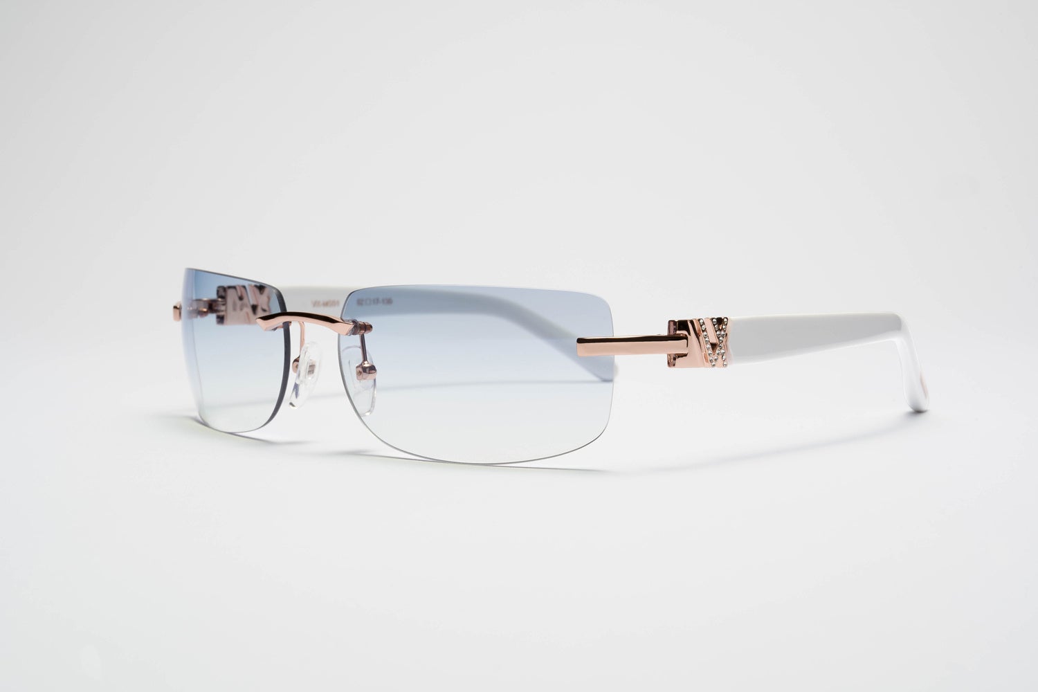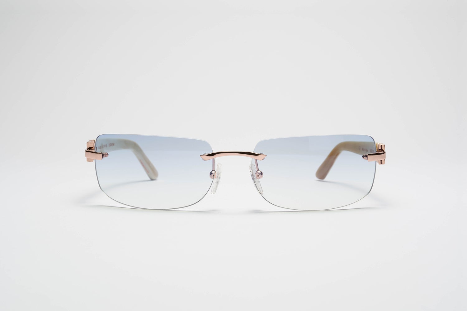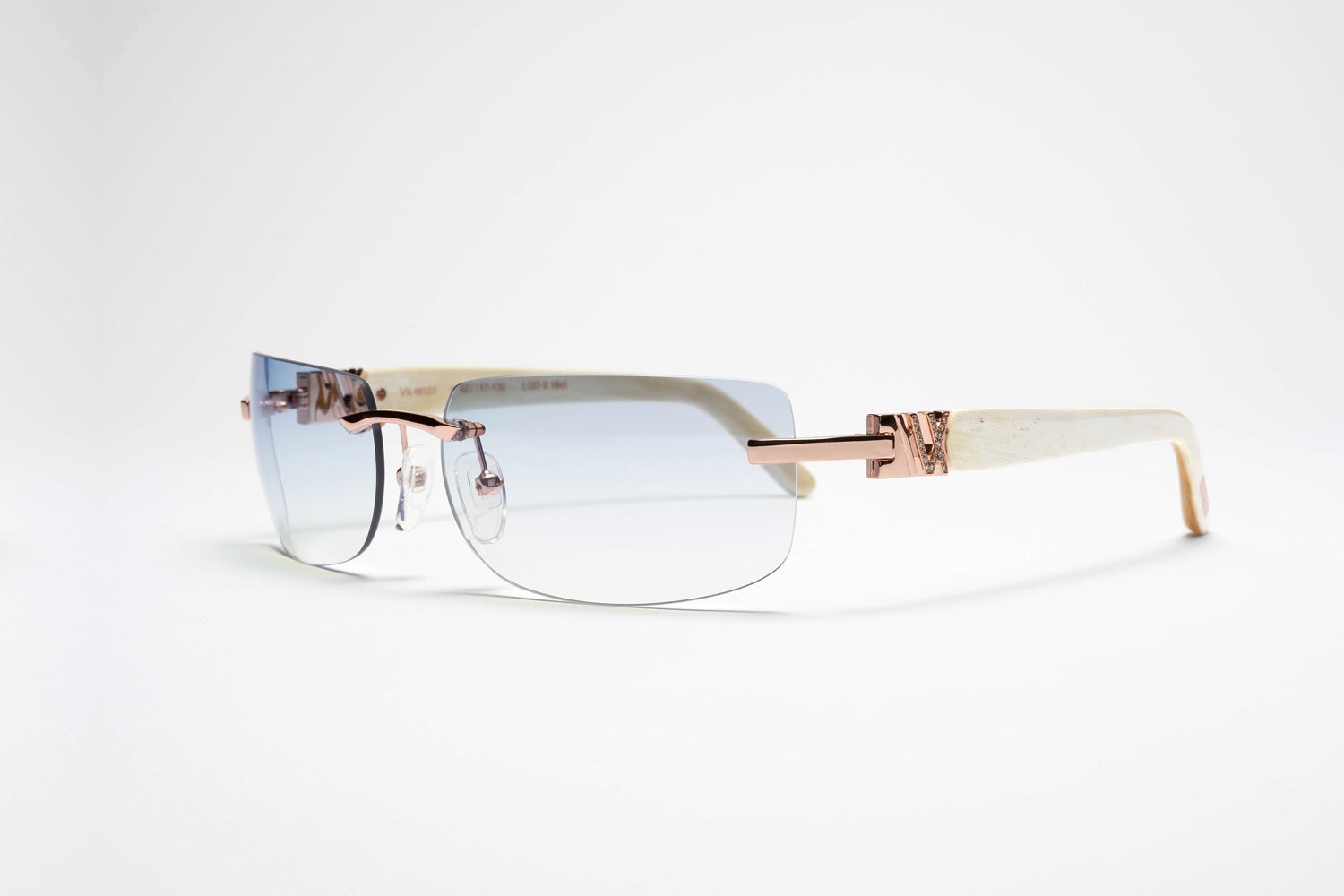 新作はブルーグラデーションレンズを採用したリムレスタイプのデザインで、2つの異なるモデルをご用意。テンプルにはバッファローホーンを使用し、ヨロイ部分にラボグロウンダイヤモンドをあしらい、VARTIXのエンブレムロゴをデザインしたモデルと、アセテートとスワロフスキーを使用したモデルの2種類を展開いたします。