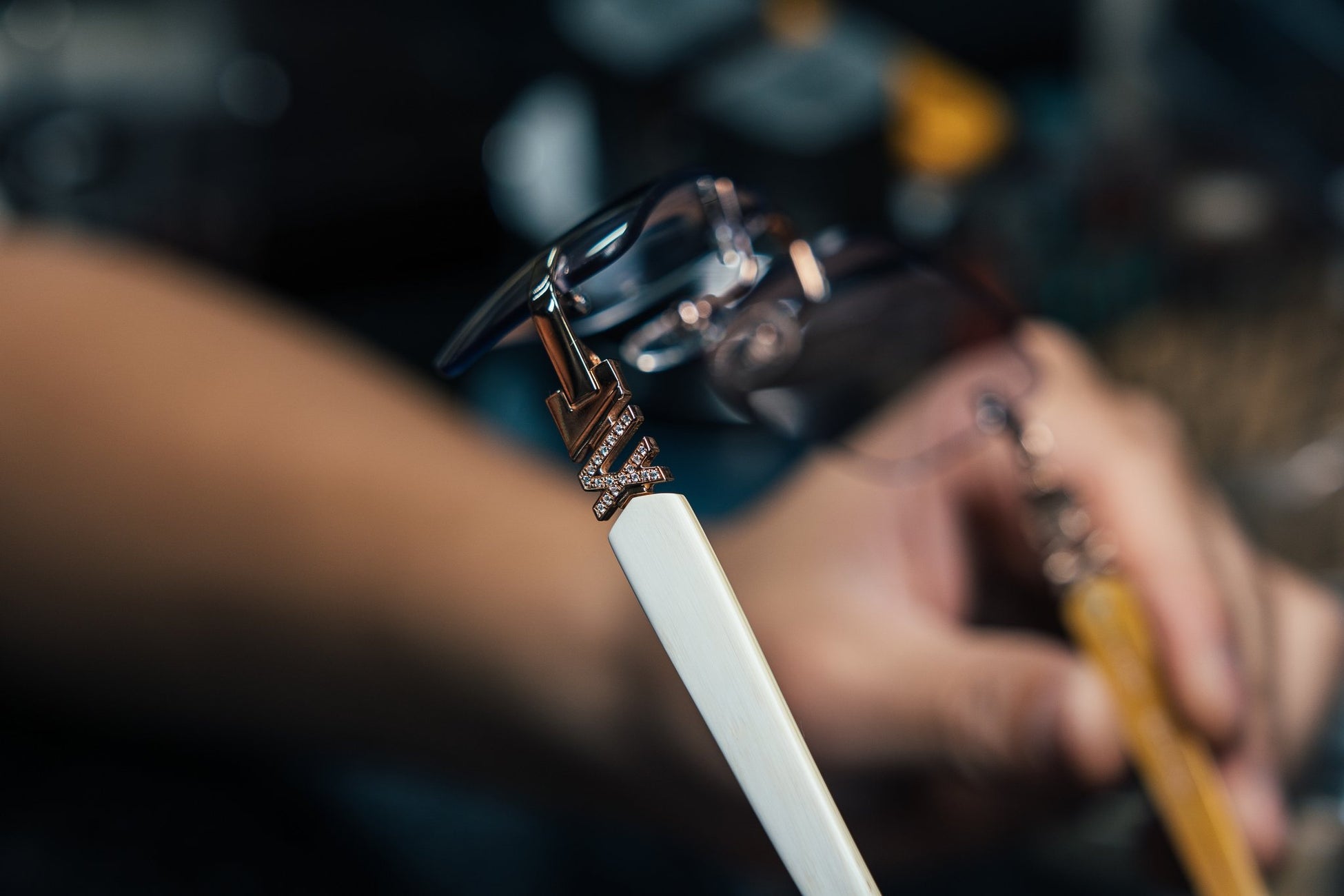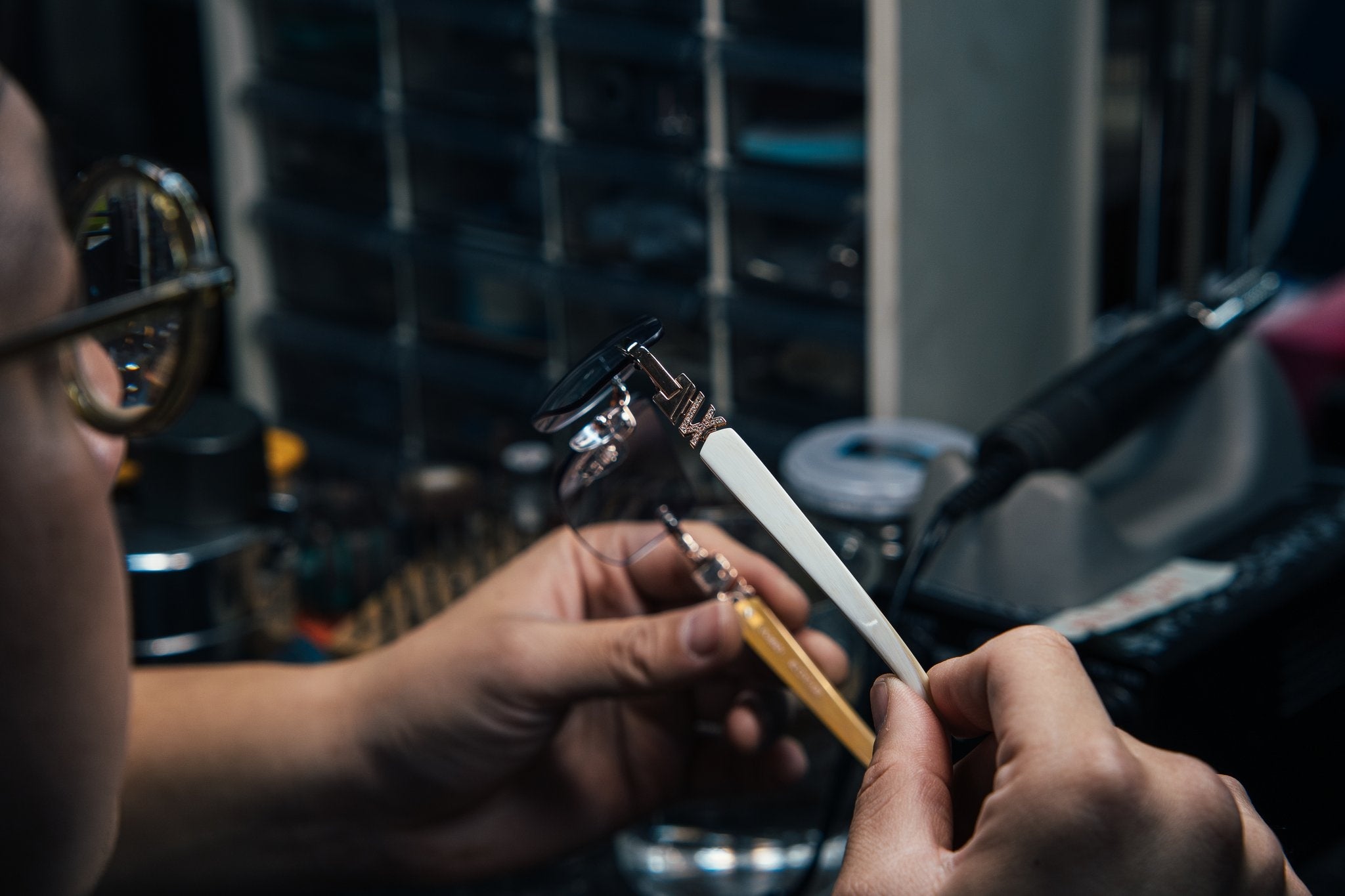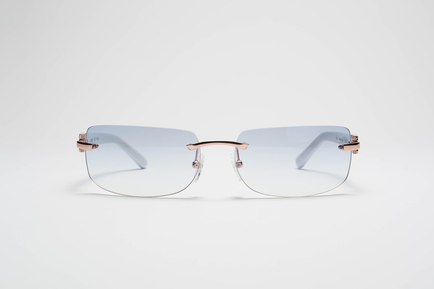 新作はブルーグラデーションレンズを採用したリムレスタイプのデザインで、2つの異なるモデルをご用意。テンプルにはバッファローホーンを使用し、ヨロイ部分にラボグロウンダイヤモンドをあしらい、VARTIXのエンブレムロゴをデザインしたモデルと、アセテートとスワロフスキーを使用したモデルの2種類を展開いたします。