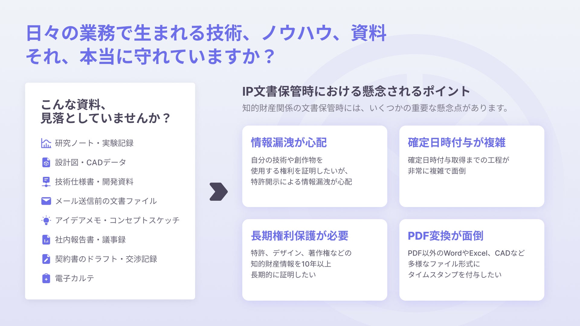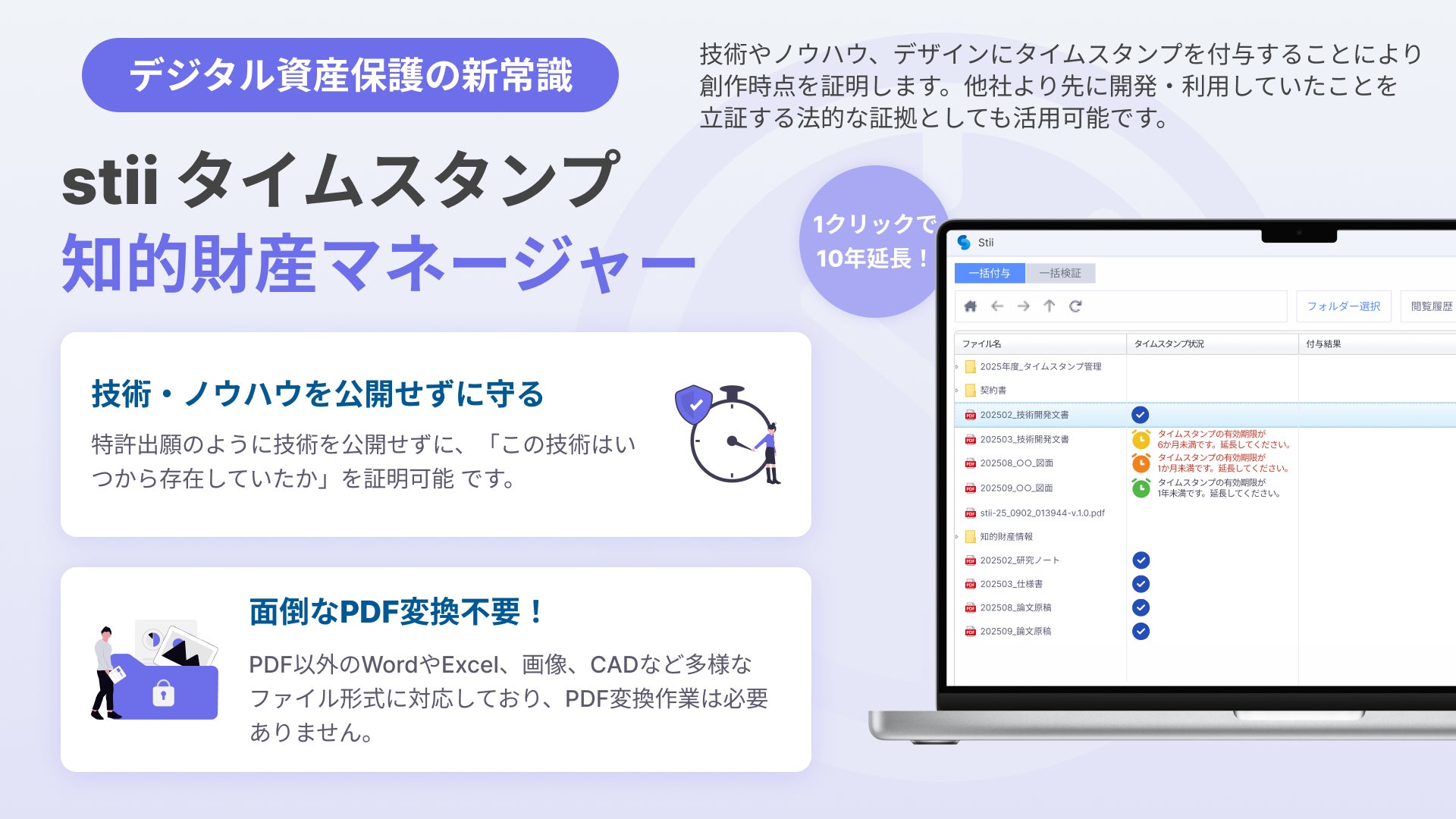 「stii タイムスタンプ知的財産マネージャー」は、研究ノートや技術資料、図面、議事録などの電子ファイルに対して、その時に“存在していた証拠”を第三者認定のタイムスタンプで残すことができる知財保護ソリューションです。