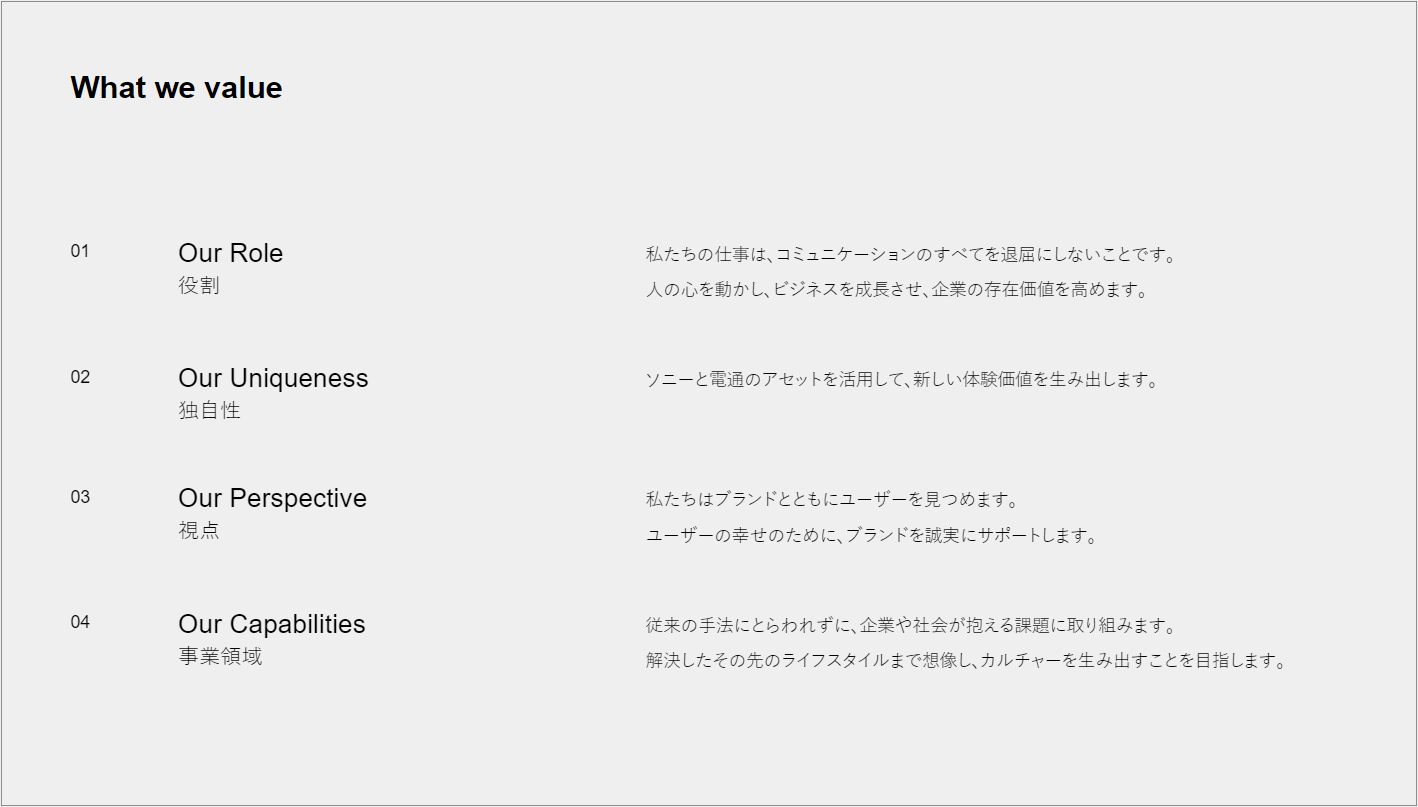広告会社としての領域を超えた「コミュニケーション エンタテインメント カンパニー」として、コミュニケーションの力で、企業・商品・サービスと社会的意義との関係を見出だし、価値を上げることを目指し続けます。