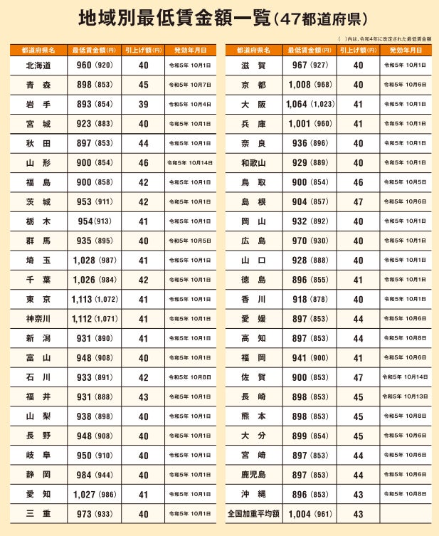改定される地域別最低賃⾦は、令和5年10⽉1⽇(⼟)より順次発効されます。この機会にぜひあなたの地域の最低賃⾦をご確認ください。