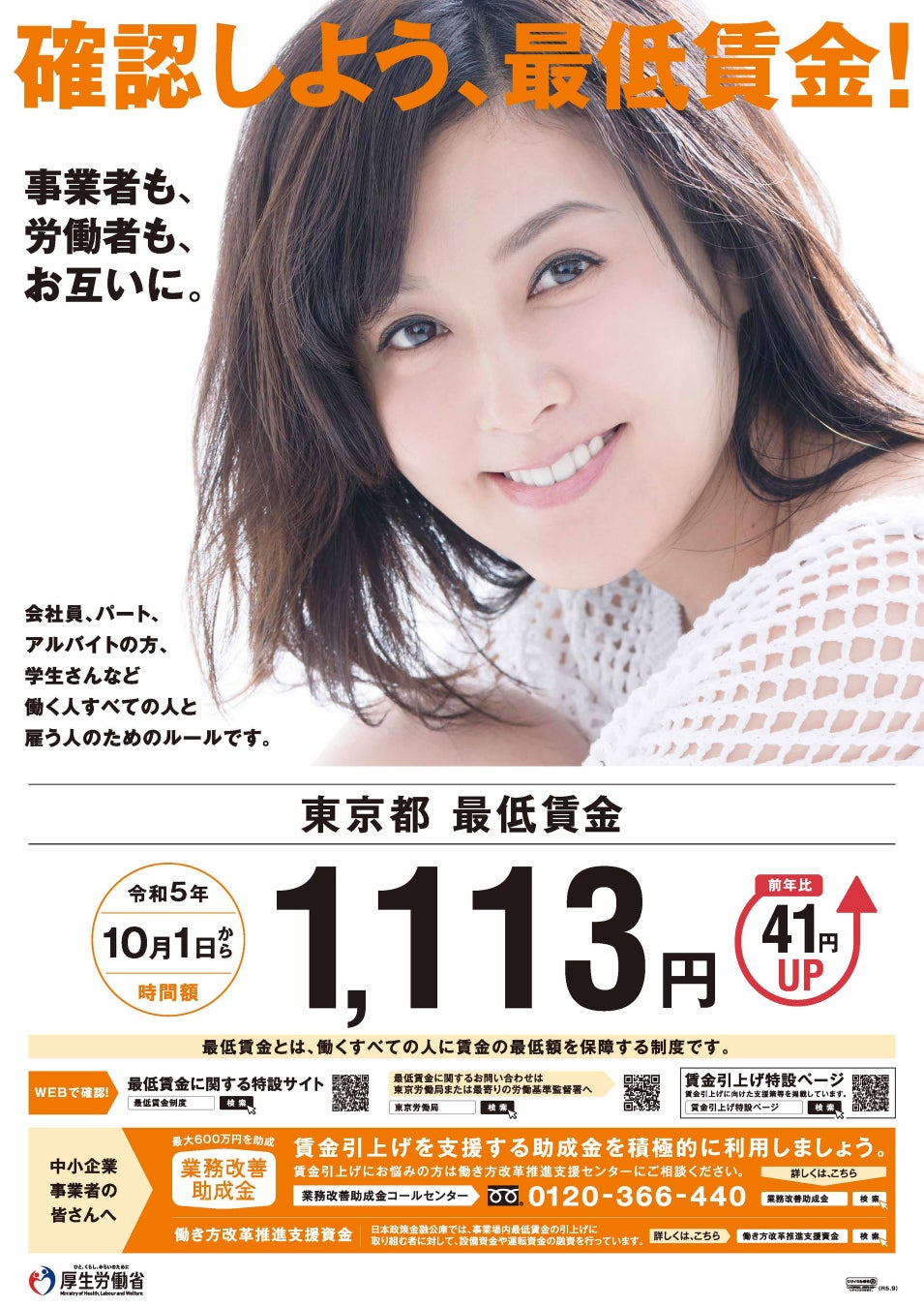 厚⽣労働省では、藤原紀香さんに最低賃金に関する広報へのご協力をいただき、令和5年の各都道府県の地域別最低賃⾦額や業務改善助成金の活用促進のためのポスター、リーフレット、パンフレットなどを作成し、交通広告やインターネット広告などにより全国にPRしています。