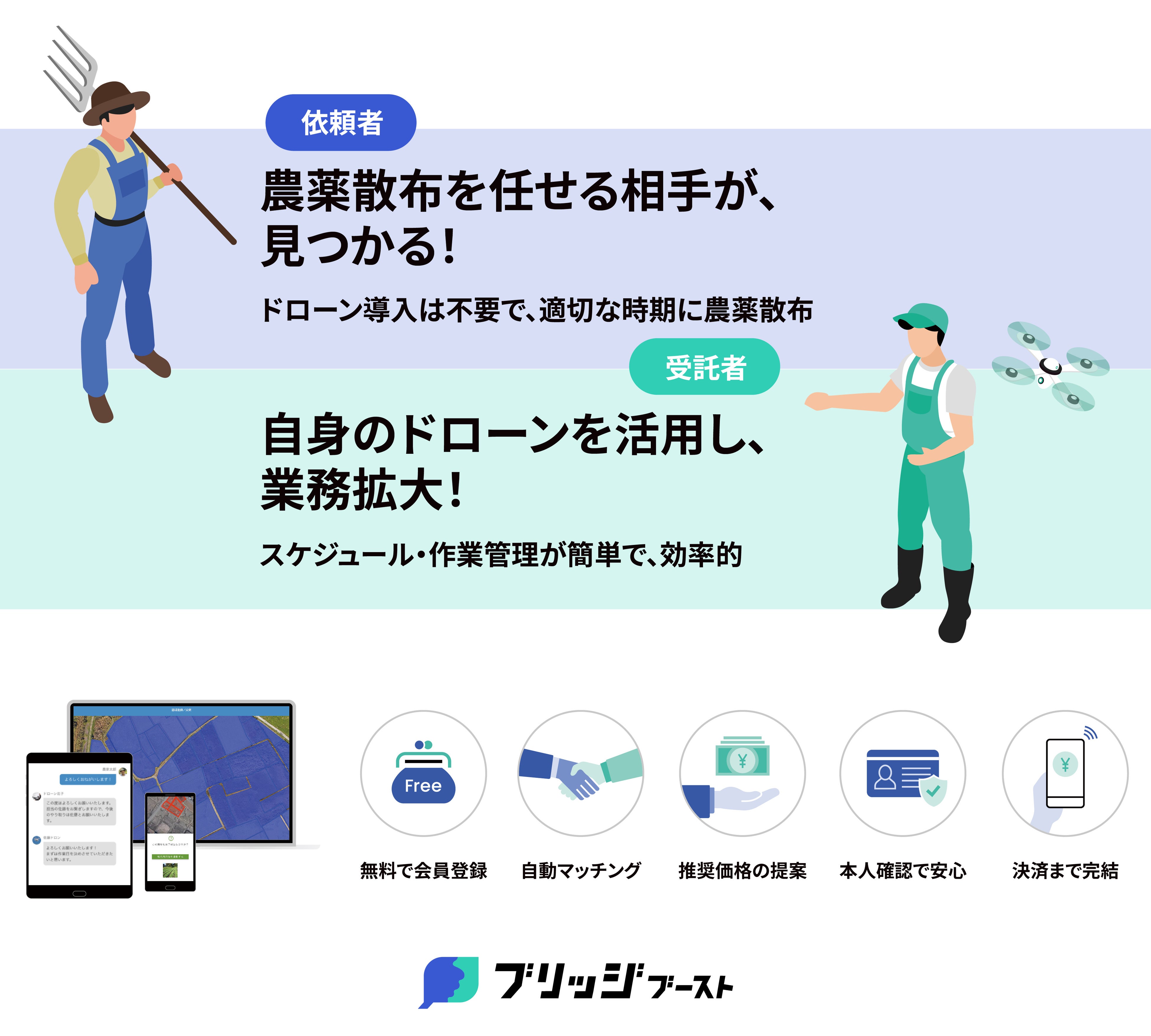 農薬散布の時期は、品種や気候に応じて地域ごとに異なります。「ブリッジブースト」を利用することにより、依頼者は、ドローン導入や操作習得は不要で、適切な時期に農薬散布を依頼することができます。また、受託者は、ドローン等を活用し農薬散布を受託できるので、新規顧客の発掘や時間の有効活用につながります。