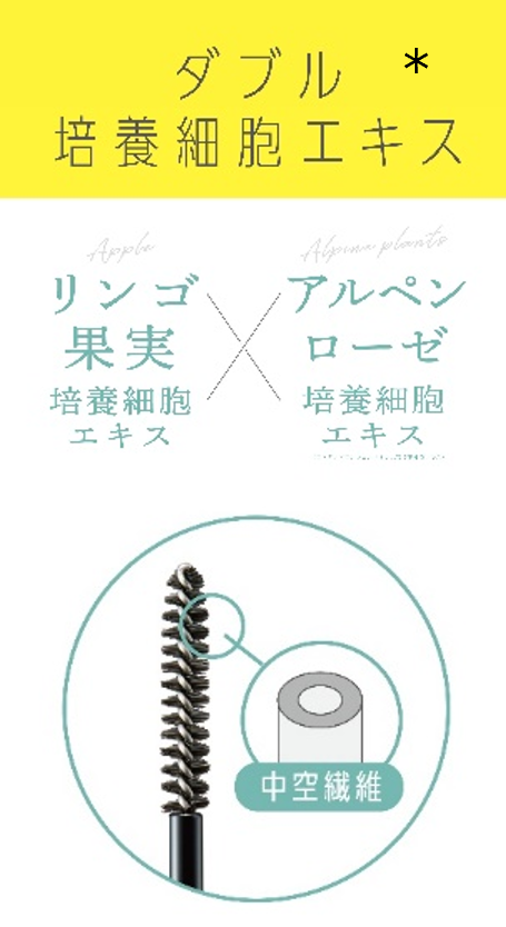 本商品は、ダメージに浸透アプローチし、ハリ・コシを与え、いきいきとしたまつ毛に導く、リンゴ果実培養エキスと、アルペンローゼ培養細胞エキス*¹をダブルで配合。メイクしながらまつ毛を優しくケアします。