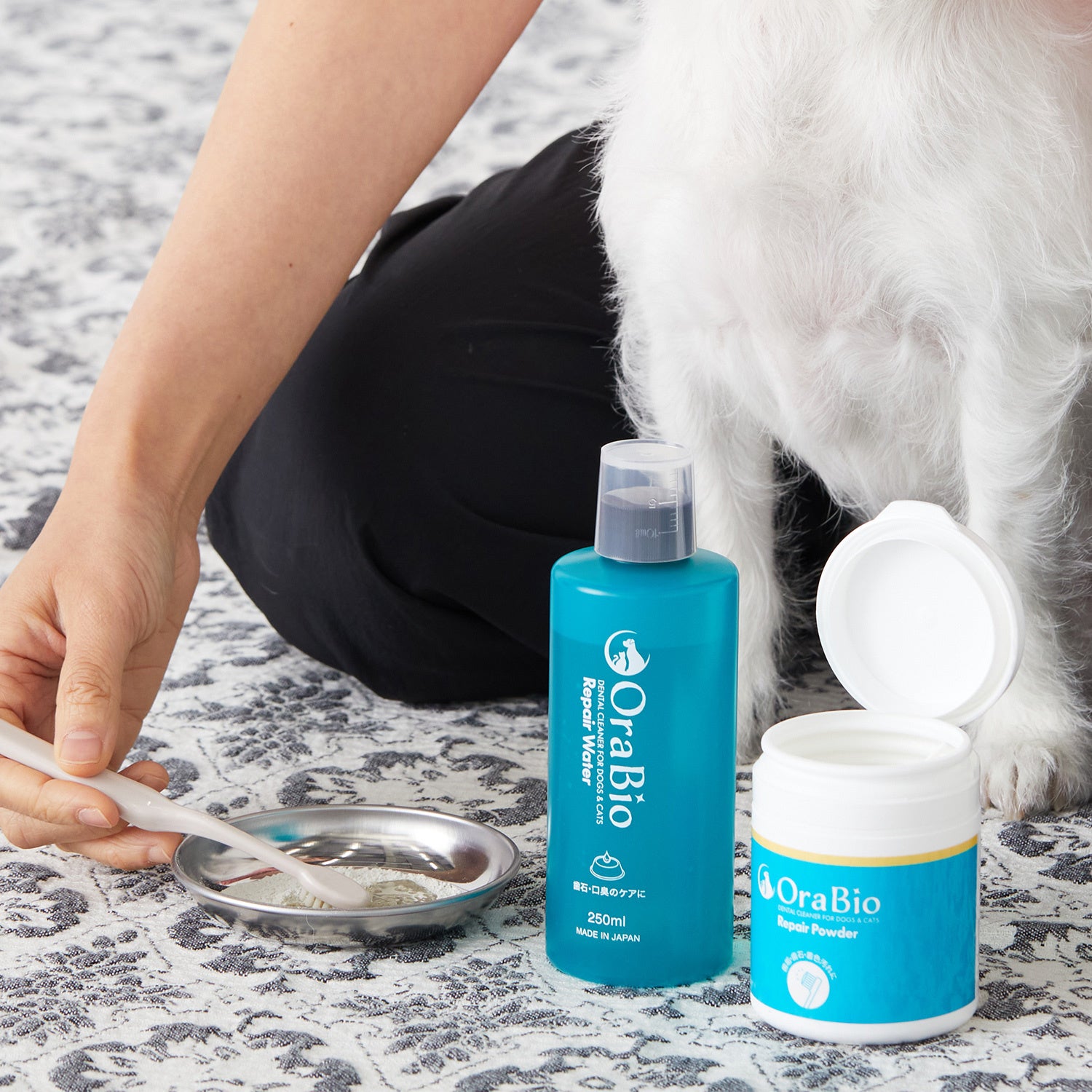 「RepairAnデンタルクリーナー」は、斥力(反発力)を利用した製品で、マイナスイオン同士の働きで反発しあって汚れが取れる画期的な製品。今回、お客様の声にお答えし、毎日お使い頂けるデイリーケアシリーズをご用意しました。その液体(リペアウォーター50ml、250ml)とパウダー(リペアパウダー90g)をそれぞれ、マウススプレー、飲み水にいれるマウスウォッシュ、粉歯磨き剤の3種類の用途で発売し、飼い主様の歯石のお悩みをサポート。