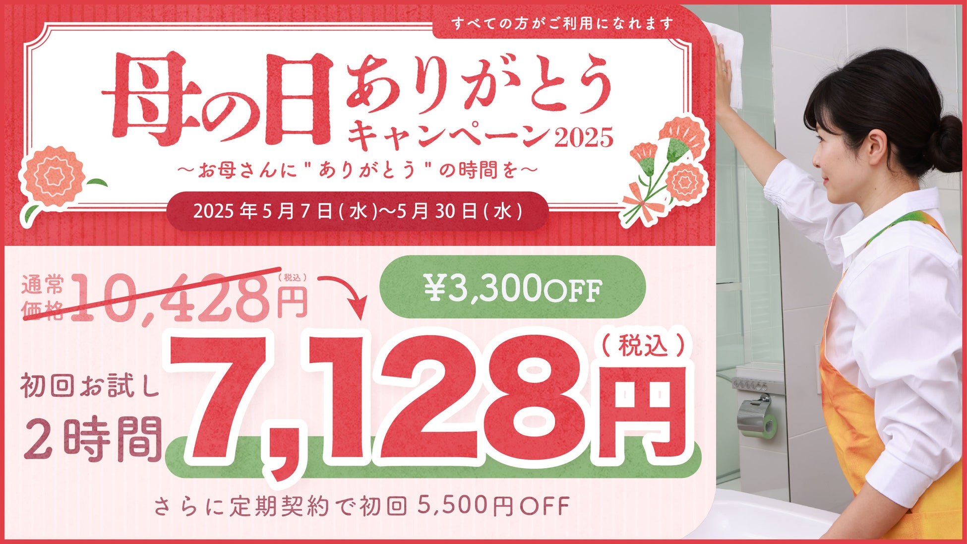 本キャンペーンでは、家事代行サービスのお試しプランを通常価格より3,300円OFFでご提供。さらに、期間中に定期サービスにお申込みいただいた新規のお客様には、初回料金が5,500円OFFとなる特典をご用意いたしました。家事に忙しいお母さんへ、心安らぐ「休息の時間」をプレゼントできる、特別な機会を提供いたします。