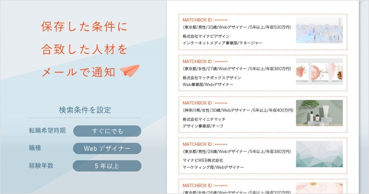 事前に採用要件を保存しておけば、要件に叶う人材が『MATCHBOX』に登録・更新をした際に、メールで通知を受け取れます。そのため効率的に求める人材を探すことが可能です。