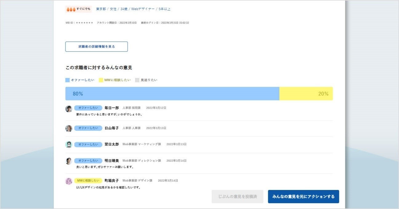 オファーを検討したい求職者がいた場合は、本当に自社の採用要件に叶った人材かどうかを『MATCHBOX』内の投票機能を使うことで、簡単に「人事採用担当者」と「配属先担当者」の間で意見交換ができます。