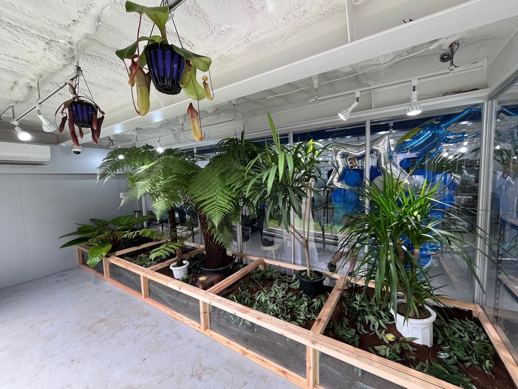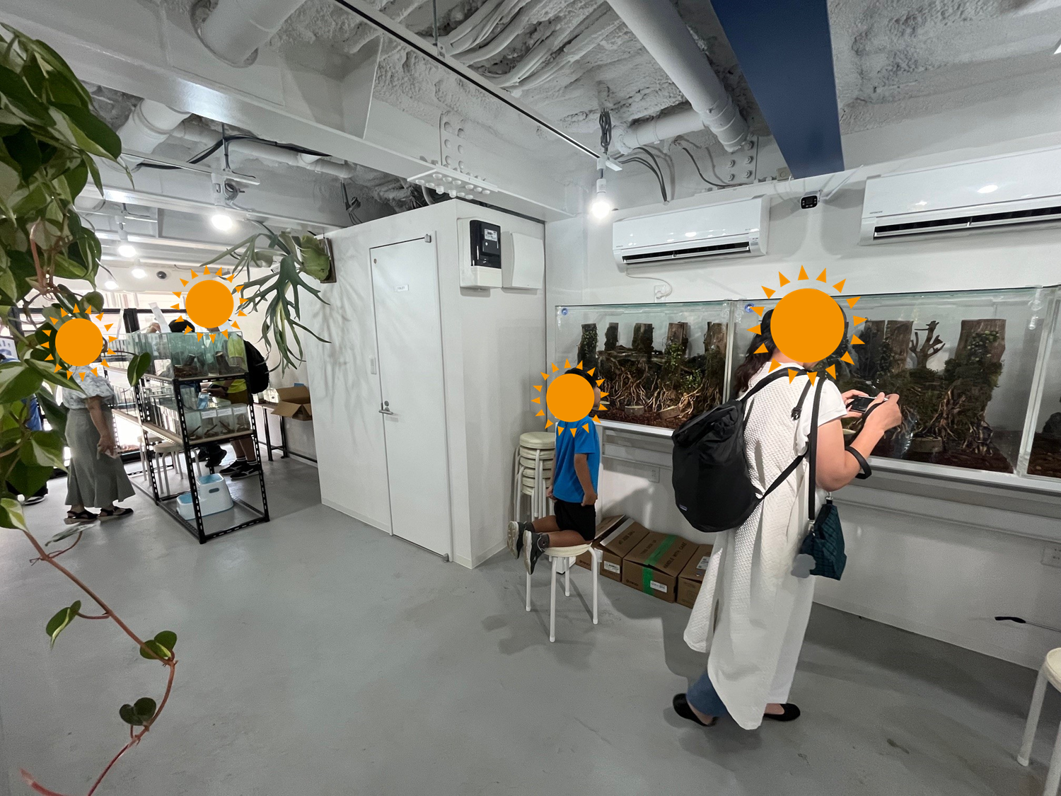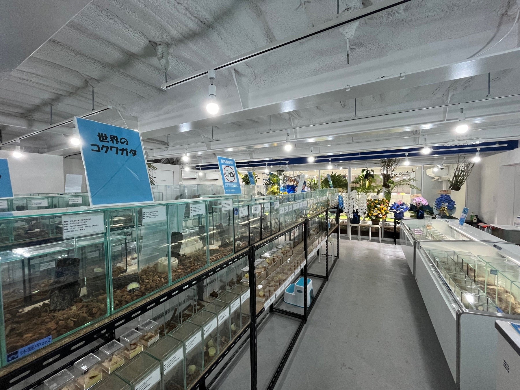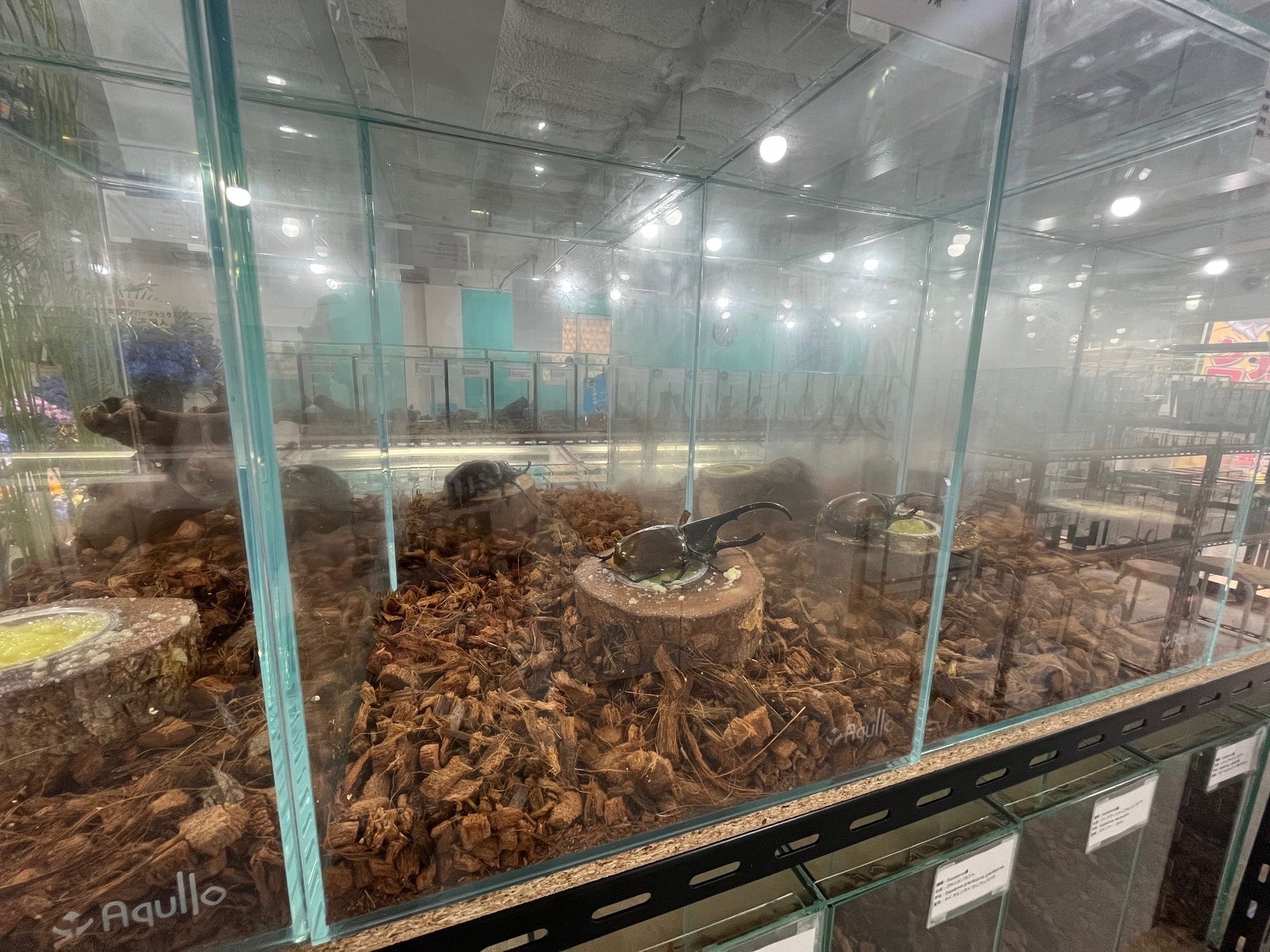 施設内には300を超えるキューブ水槽に加えて、大型水槽には大きなテラリウムに多数のクワガタとカブトムシが配置されており、まるで大自然の中で昆虫を探すかのような体験をすることができます。
