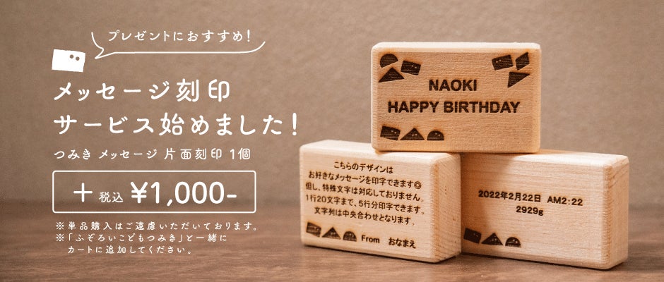 建築現場の余剰木材から生まれたサステナブルな積み木セット「ふぞろい こども つみき」が、ご出産祝いやご入園祝いにも使えるメッセージ刻印サービスを開始。