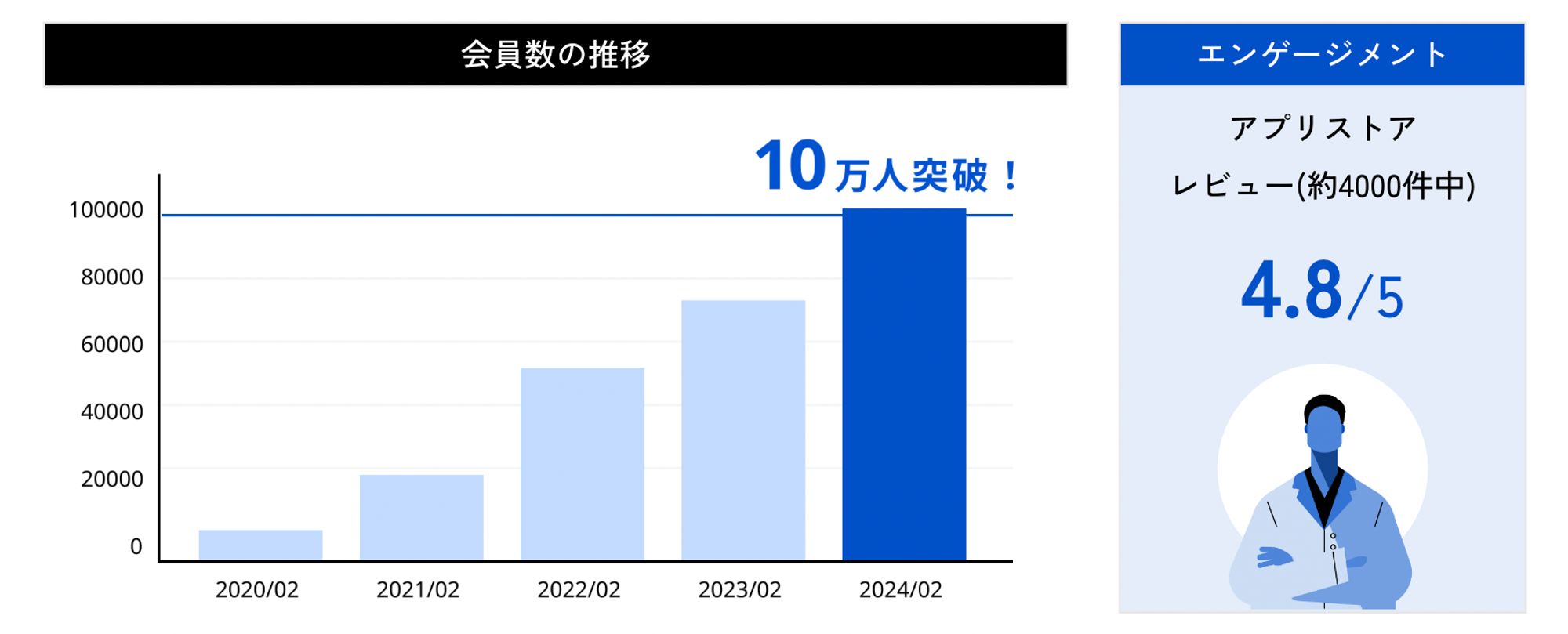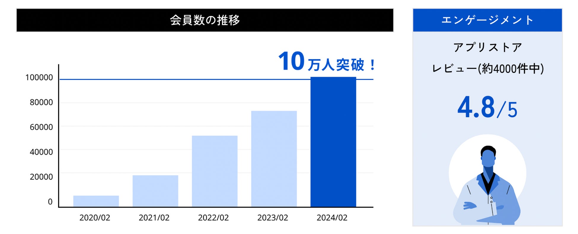 医師会員数は、リリース後約4年で10万人(※日本の医師の約3人に1人)を突破。App Storeでのレビューは5点満点中4.8点以上の高評価をキープしており、実際に医療現場で働く医師の方からご好評の声を多数いただいております。