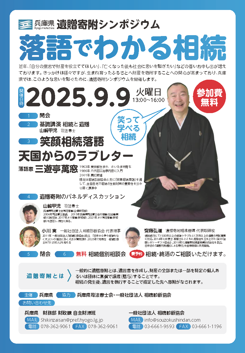 一般社団法人相続診断協会と兵庫県司法書士会が運営を行い、落語やパネルディスカッションをとおして、相続や遺贈寄附について市民の方へ楽しくわかりやすくお伝えします。