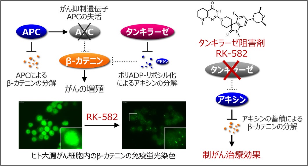 大腸がんの約80%は、がん抑制遺伝子APC の機能喪失型変異によりWnt/β-カテニンシグナルの亢進を示します。しかし、同経路には創薬展開が可能な標的分子が存在せず、このシグナルを遮断するがん治療薬の開発は困難とされてきました。ポリADP-リボシル化酵素(注3)ファミリーの一員であるタンキラーゼは、β-カテニンの抑制因子アキシンを分解に導くことでWnt/β-カテニンシグナルを増強します。このことから、タンキラーゼの阻害剤はアキシンの分解を阻害することでWnt/β-カテニンシグナルを抑制して、大腸がんの増殖などを抑える治療薬になる可能性があります。我々が創製したタンキラーゼ阻害剤RK-582は、APC 変異陽性大腸がん細胞のWnt/β-カテニンシグナルを遮断し、マウスゼノグラフトモデルにおけるin vivo 腫瘍増殖を抑制しました。これまでにラット、イヌ、およびサル等を用いた毒性試験、安全性薬理試験、ADME(注4) 等に関する検討を進め、治験開始に必要な非臨床データパッケージを構築しました。医薬品医療機器総合機構と非臨床試験の充足性および第Ⅰ相治験の治験デザインの適切性について合意に至り、がん研有明病院の治験倫理審査委員会の承認を得たのちに、治験を開始しました。