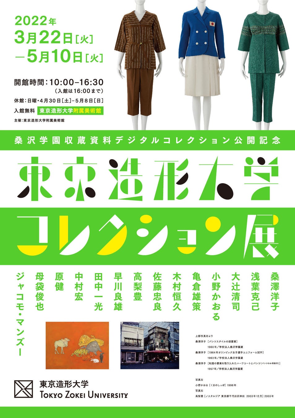 今回の展覧会では、そうした所蔵作品から、創立者である桑澤洋子(服飾デザイナー)の関連資料をはじめ、絵画、版画、ポスター、写真など、幅広いジャンルの作品約100点をセレクトしました。これらの作品を通じて、20世紀後半の美術史・デザイン史とともに、東京造形大学の歴史についても思いを馳せていただければと思います。