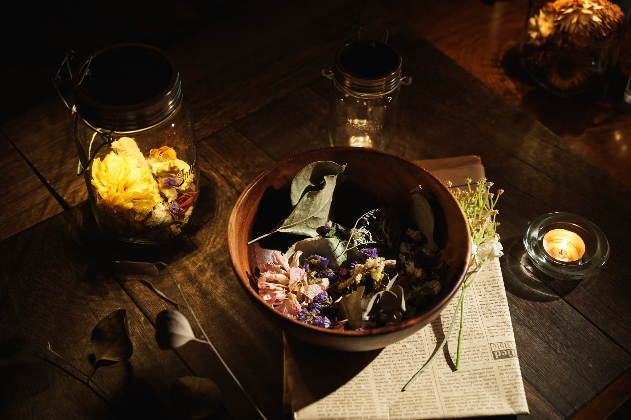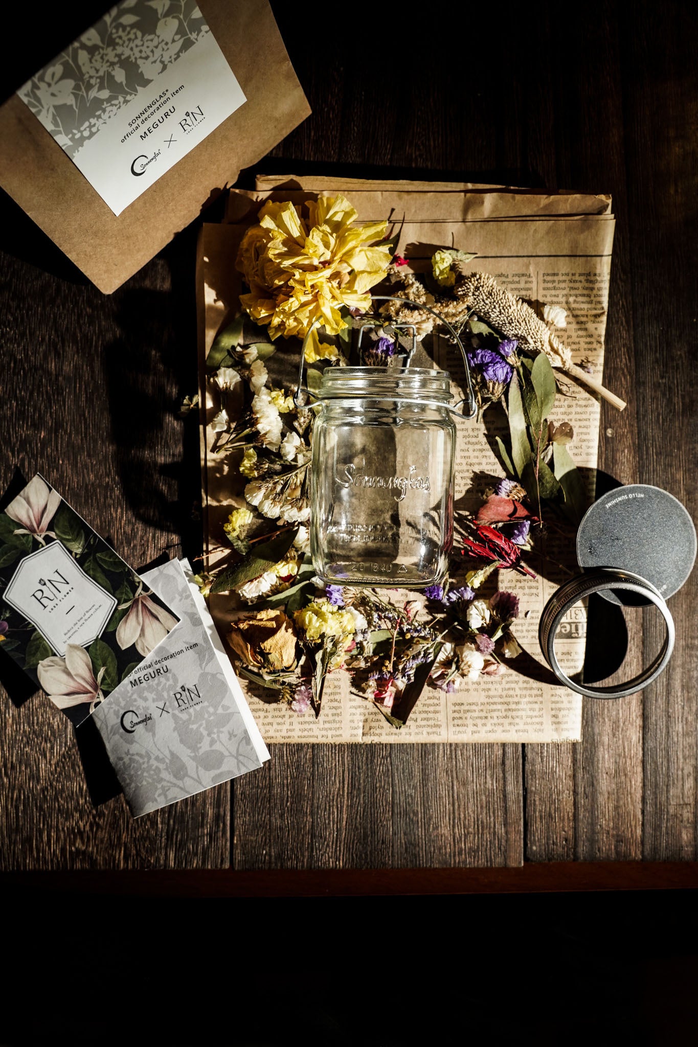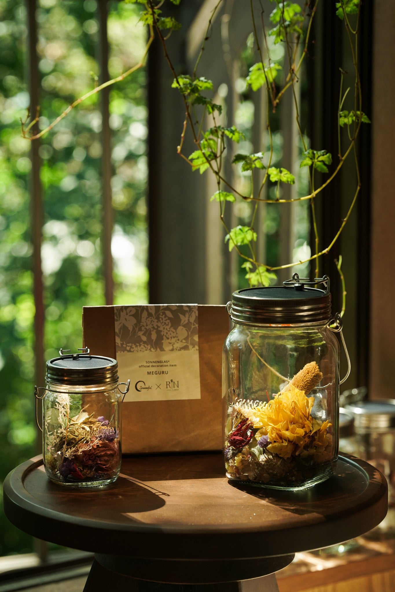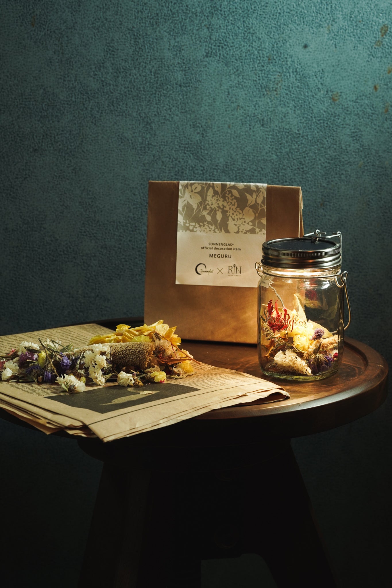 “MEGURU”は、瓶の中に入れて「ソネングラス®︎」をデコレーションするドライフラワーで、生花店や式場などで役目を終えた花たちをアップサイクルしている「RIN」の花たちを使用しています。ドライフラワーへ加工する過程や、ディスプレイの制作時に図らずも生まれてしまう色鮮やかな花びら一枚まで、大切に、花の生命が最後まで輝くように、という思いから生まれた商品です。