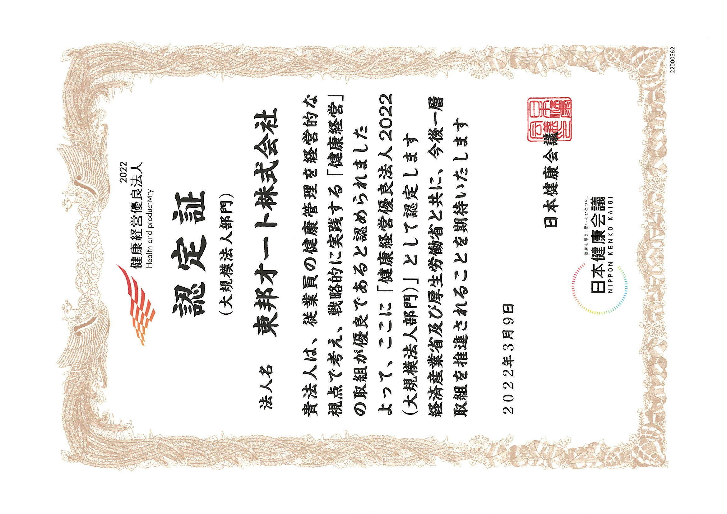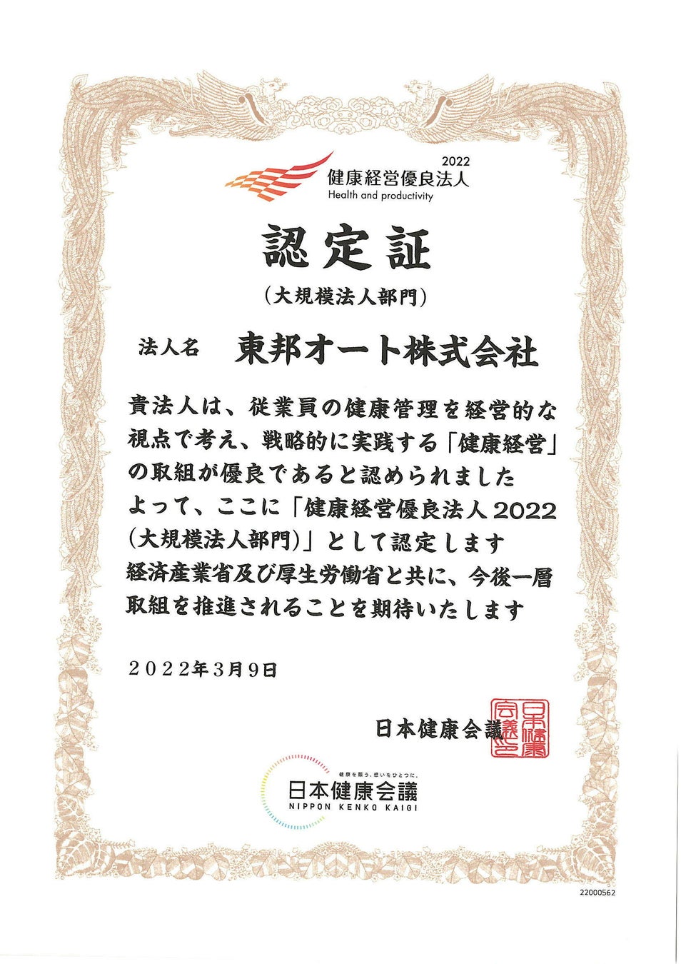 東邦ホールディングスグループ傘下で、ボルボ正規ディーラー 東邦オート株式会社(本社:千葉県千葉市美浜区、代表取締役 秋葉 佑)は、この度、経済産業省と日本健康会議が共同で選出する「健康経営優良法人認定制度」の大規模法人部門において「健康経営優良法人2022」に5年連続で認定されました。