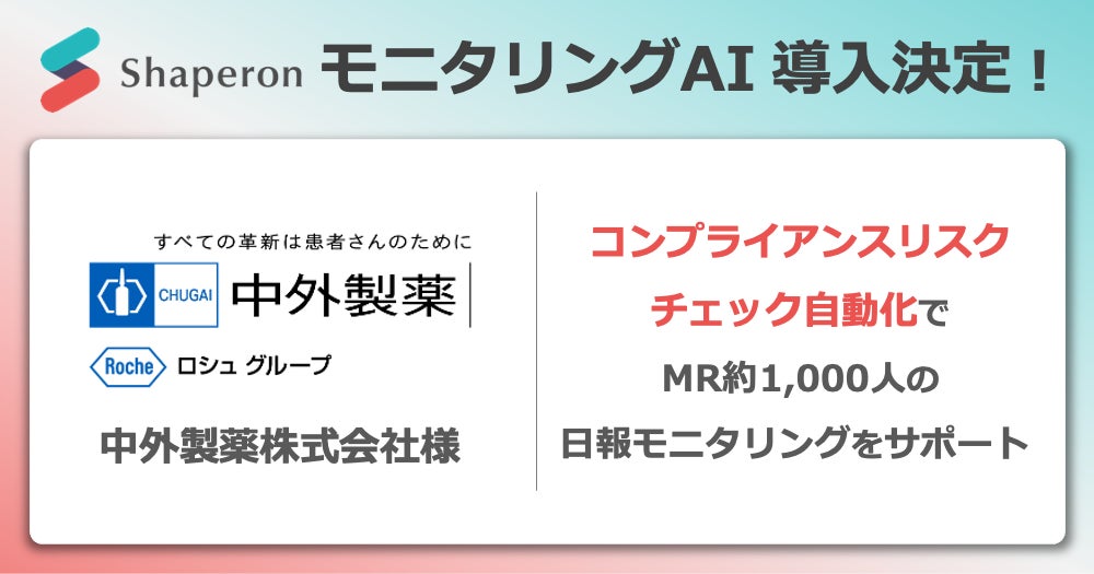 株式会社シャペロン(本社:東京都世田谷区、代表取締役:阪本 怜)が提供する製薬企業向けコンプライアンスチェックサービス「モニタリングAI」が、中外製薬株式会社(本社:東京都中央区、代表取締役社長 CEO:奥田 修)に導入されることが決定しました。