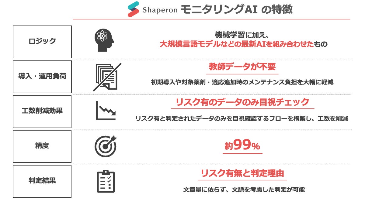 以下にあげたモニタリングAI独自の特徴が中外製薬株式会社から評価されました: