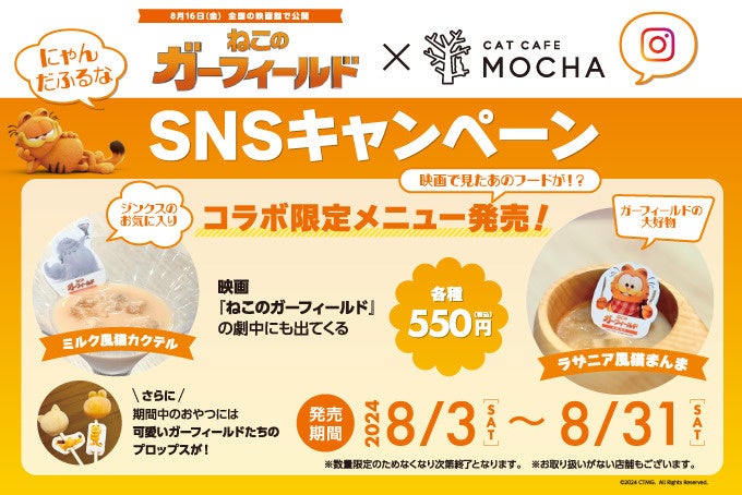 全国に猫カフェを展開するリポット株式会社(本社:東京都新宿区、代表取締役:岩﨑康二)は、8月16日(金)公開の映画『ねこのガーフィールド』の公開を記念して、コラボキャンペーン「ねこのガーフィールド×猫カフェMOCHA にゃんだふるなSNSキャンペーン」を 2024年8月3日(土)から2024年8月31日(土)まで 猫カフェMOCHA 全国30店舗で実施いたします。