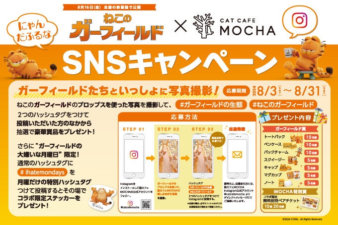 本キャンペーンでは、猫カフェMOCHA公式Instagram( @catcafemocha )にて、指定のハッシュタグをつけてご投稿いただくと抽選で映画『ねこのガーフィールド』限定グッズが当たるSNSキャンペーンを 2024年8月3日(土)より開催します。また、月曜日がきらいなガーフィールドにちなんで、期間中の月曜日限定で指定ハッシュタグを追加しご投稿いただくと、その場でコラボ限定ステッカーをプレゼントいたします。