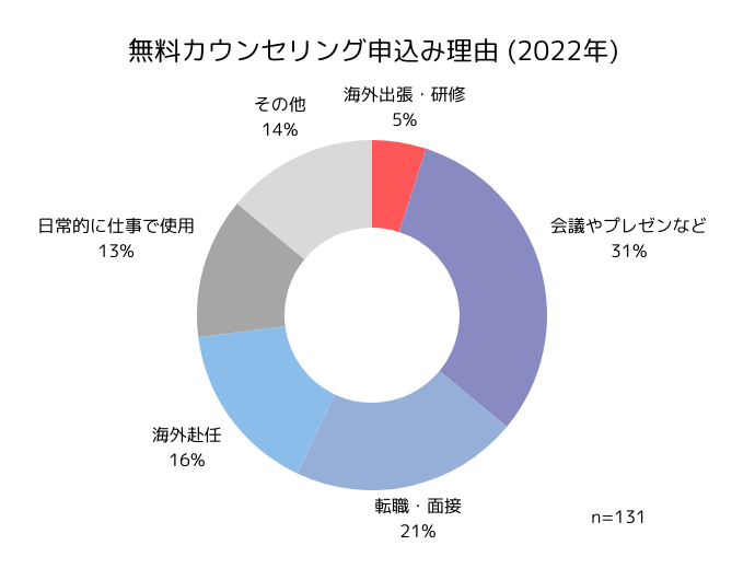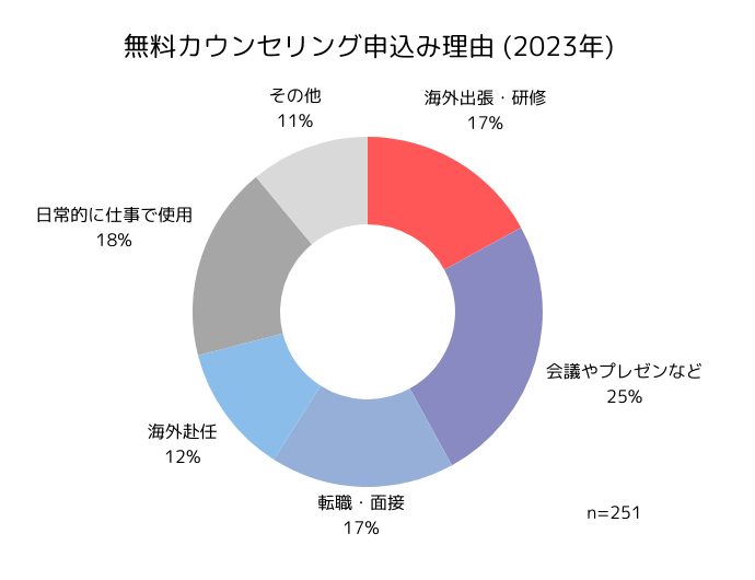 コロナ禍でオンライン化が進んだビジネスシーンですが、2023年に入ってからは海外出張の機会が増えてきています。それにともなってプロフェッショナルな英語の必要性も高まっており、One Month Programの無料カウンセリング申し込み者のうち、英語が必要な理由に「海外出張・研修」と答えた人は2022年の5%から2023年の17%に急増しました。これは3倍以上の増加です。