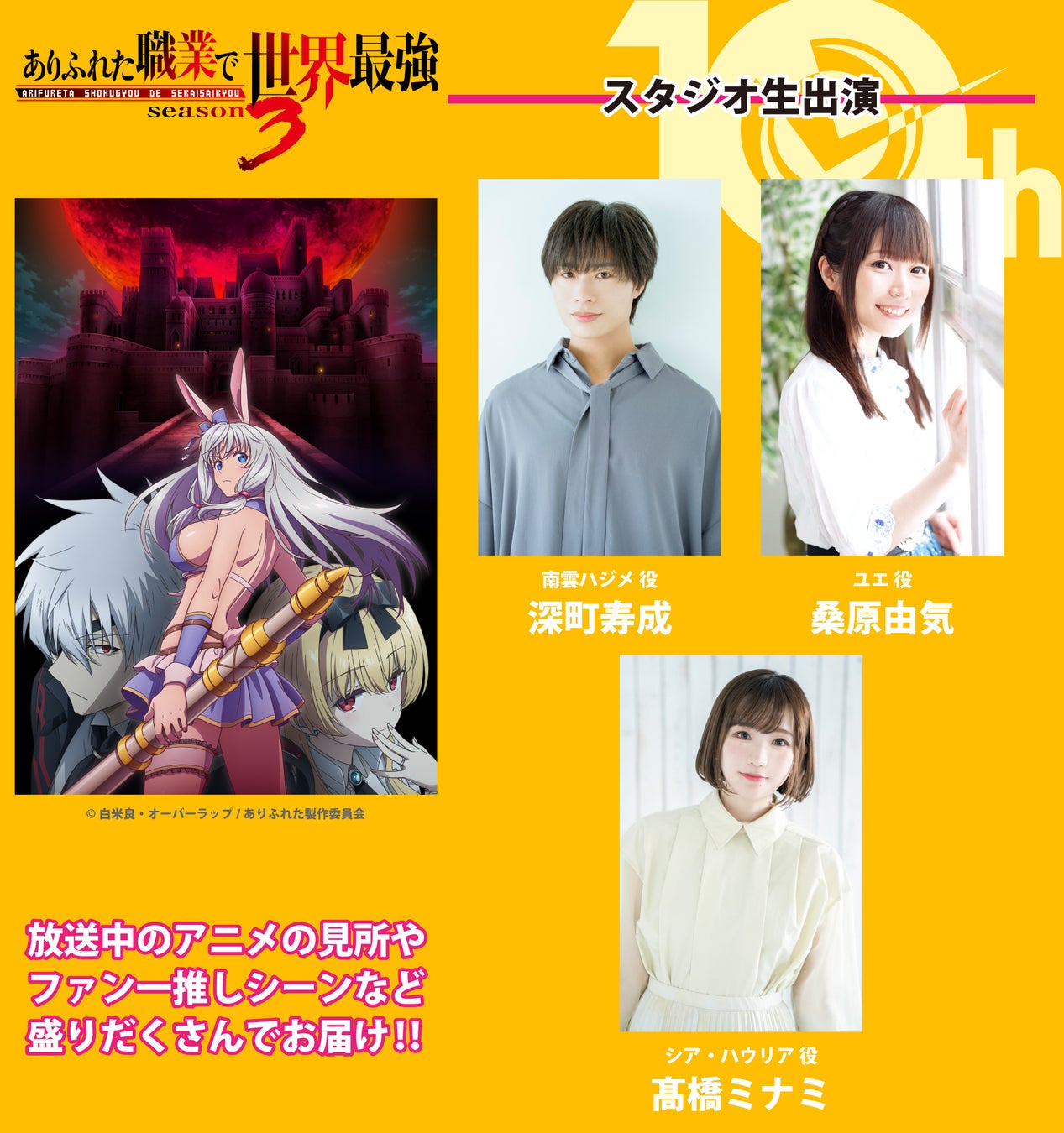 放送中アニメ「ありふれた」より深町寿成、桑原由気、髙橋ミナミ、「話術士」より山下大輝、芹澤優、「ぼっち攻略」より梅田修一朗、直田姫奈がスタジオ生出演!アニメ化作品初解禁情報など盛りだくさん!