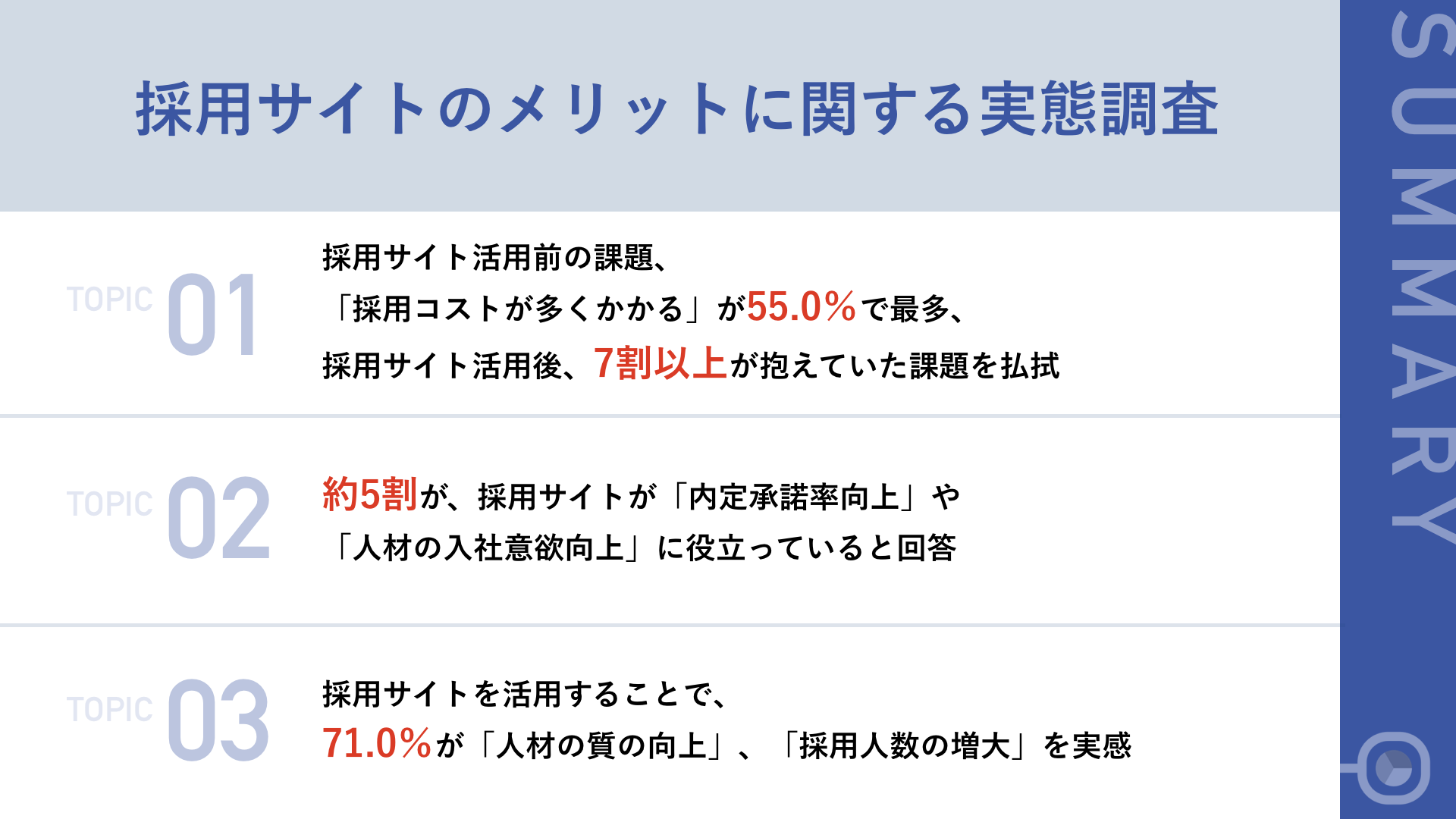 今回の調査では、採用サイトを活用することによって、多くの企業が採用に関わる課題解決に至っており、その重要性が明らかとなりました。今後は、採用サイトを作成する上で「求人サイトとの自動連携」や「独自ドメインの取得」など、様々な機能がセットになったサービスが求められているのではないでしょうか。