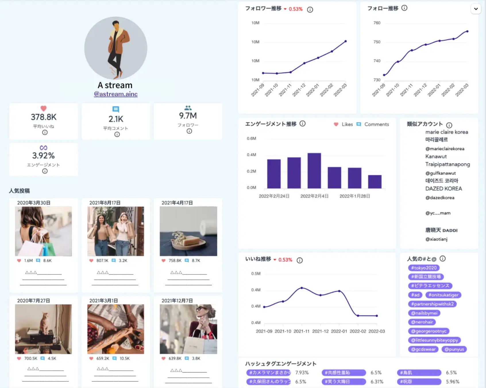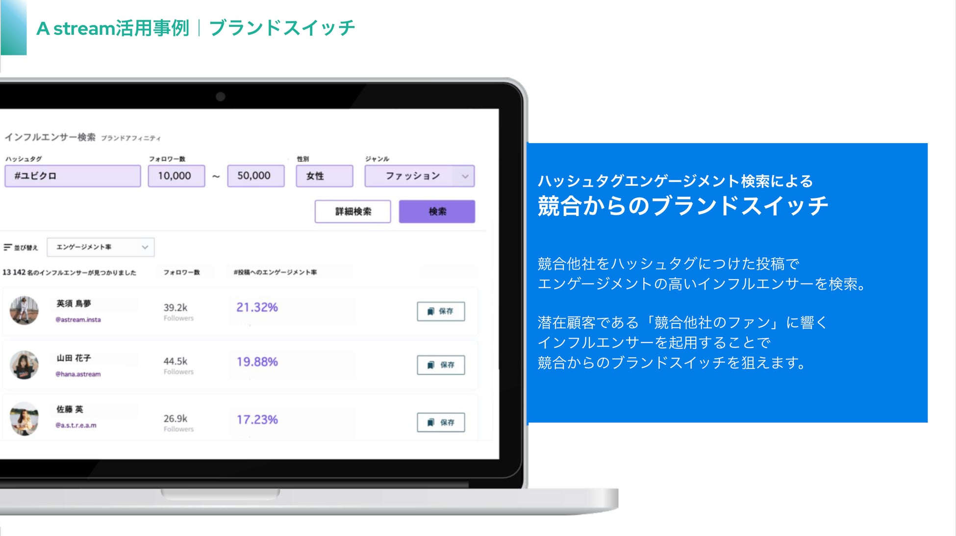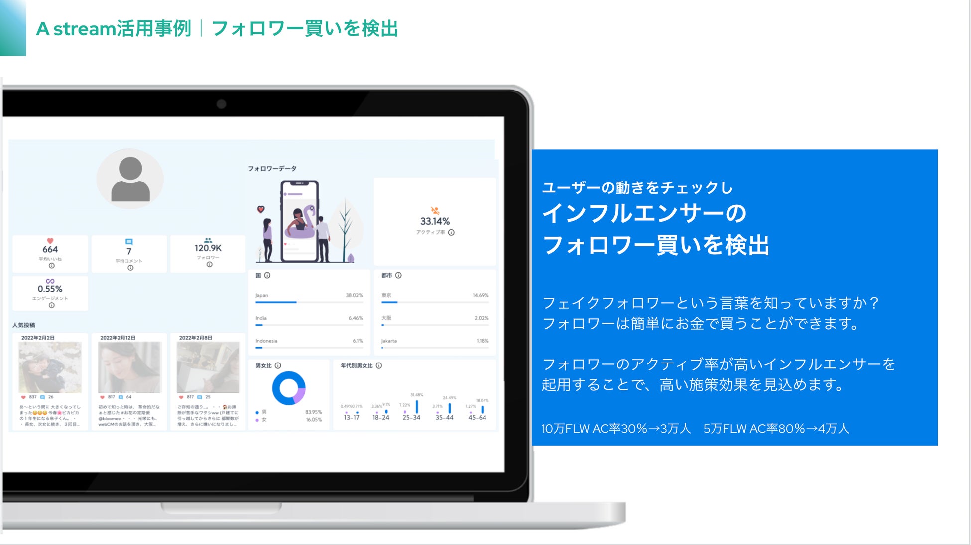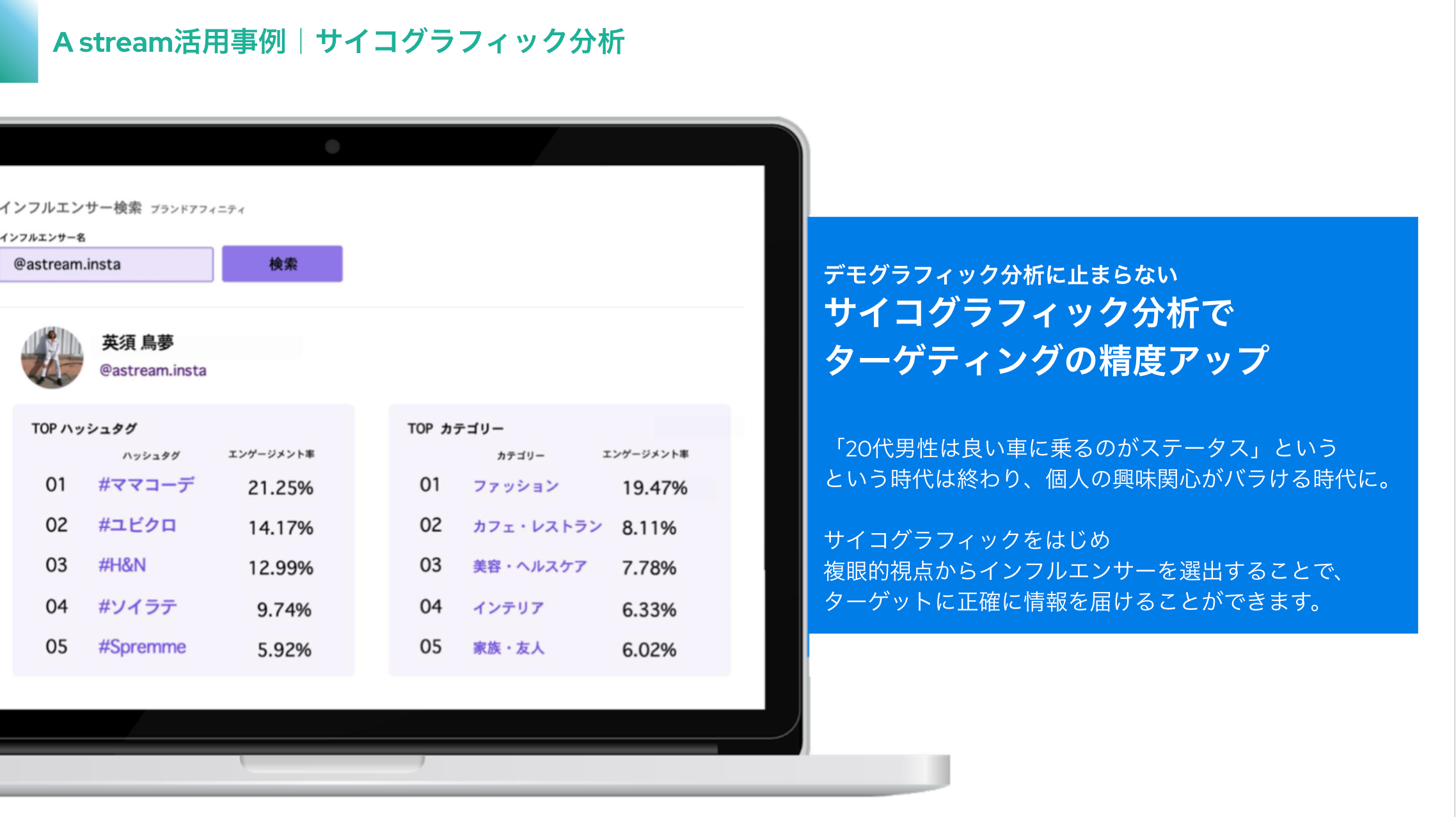 『A stream』はこれまで取得不可能であった、インフルエンサーのフォロワーの”興味関心”や”ブランドの好み”といったサイコグラフィック情報の分析を可能にする新時代のAIマーケティングツールです。