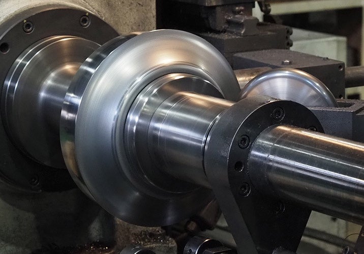 円型の金属板を高速回転させながらゆっくり延ばし成形していく「へら絞り加工」も特長の一つ。プレス加工に比べて手間がかかりますが、側面を薄く仕上げることができ、軽量化につながるメリットがあります。