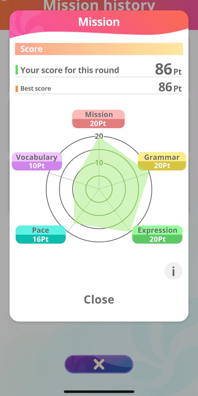 ミッション終了後には、プレイヤーの会話内容をAIが自動解析し、英会話スキル別のスコアリングの出力および、改善のためのアドバイスを受けることができます。プレイ時点での英語力が可視化されるので、トレーニングを続ける中で、英語力の向上を実感することができます。