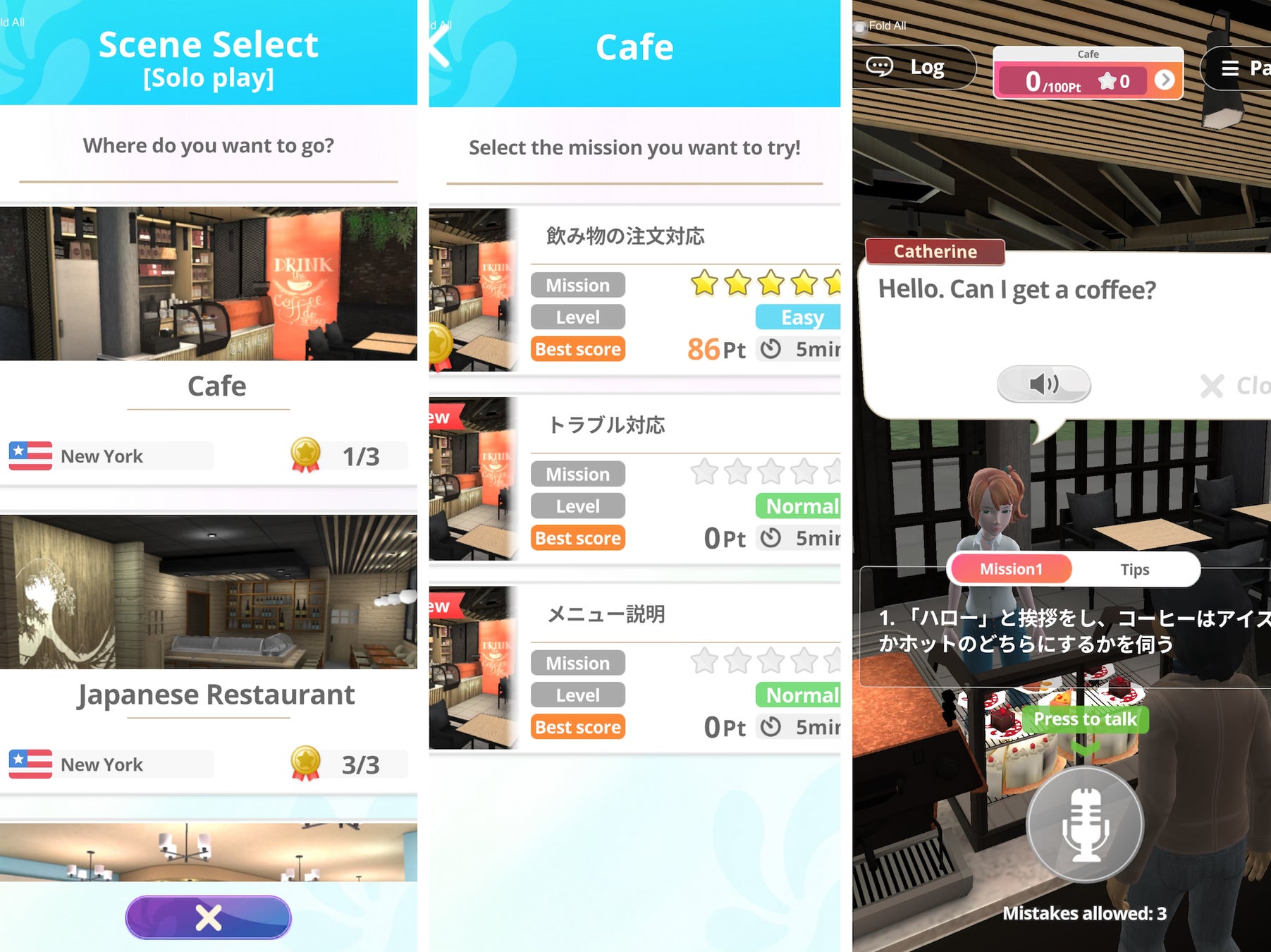 今回用意した、カフェ・ジャパレス・ホテルの3つの空間では、それぞれの空間ごとに、20個の接客ミッションが用意されていて、そのミッションのクリアを目指して、AIとの英会話トレーニングに挑戦いただきます。