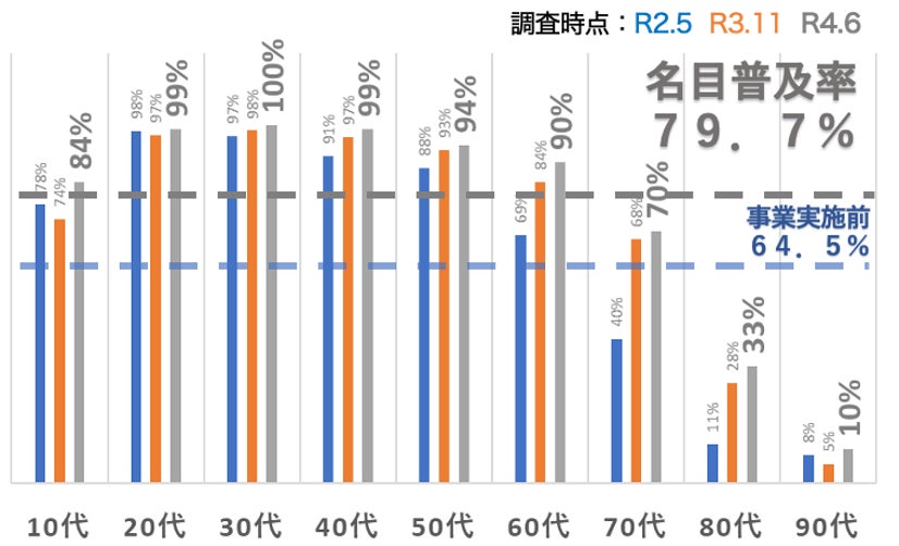 当該事業を実施前のアンケート調査において普及率は、64.5%(令和2年5月時点)でしたが、事業開始(令和3年6月)から約1年後には、79.7%と住民に対して約8割の方にお持ちいただくことができました。また、こちらの普及率の算定分母においては、全住民になっているため、0−9歳までの子どもや障がい等級中度以上、介護認定4以上の住民を除いた場合の実質普及率においては、86.0%と8割以上の方々に持っていただいている状態になっています。