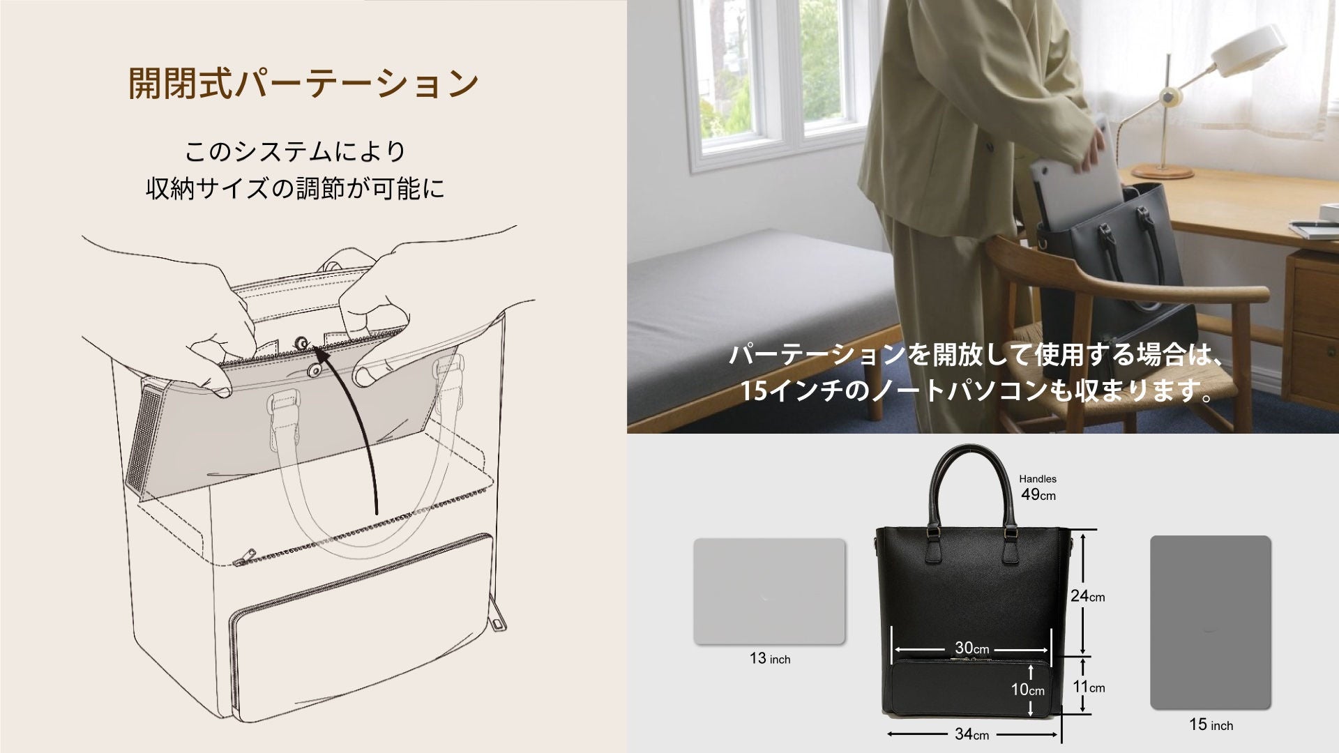 分別収納ができる出しやすく、しまいやすいトートバックです。