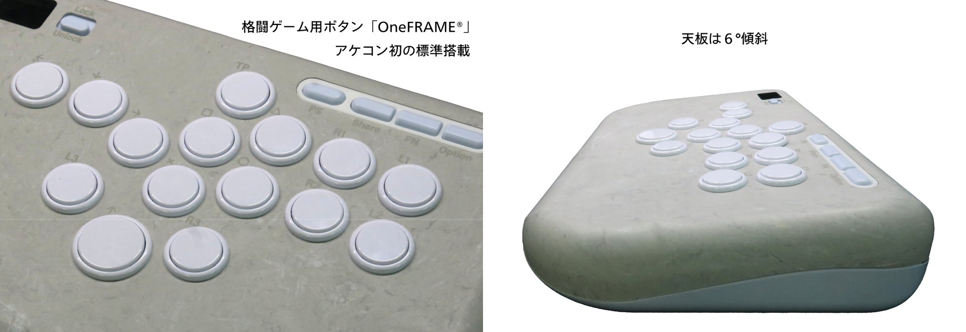 低ストロークの格闘ゲーム用ボタン「OneFRAME®」をアケコンとして初の標準搭載。有機ELディスプレイ、スライドスイッチ、ボタンロック機能や、天板6°傾斜構造により快適な操作を実現。