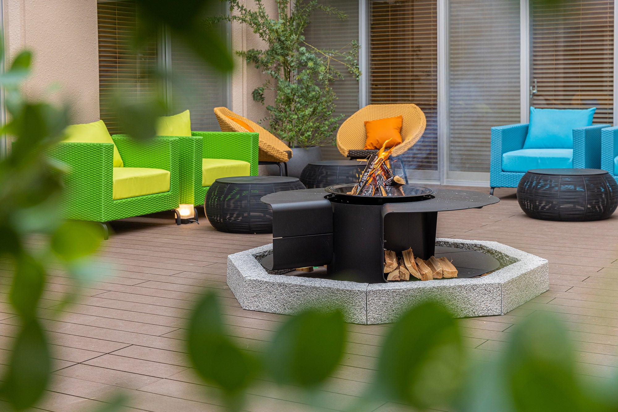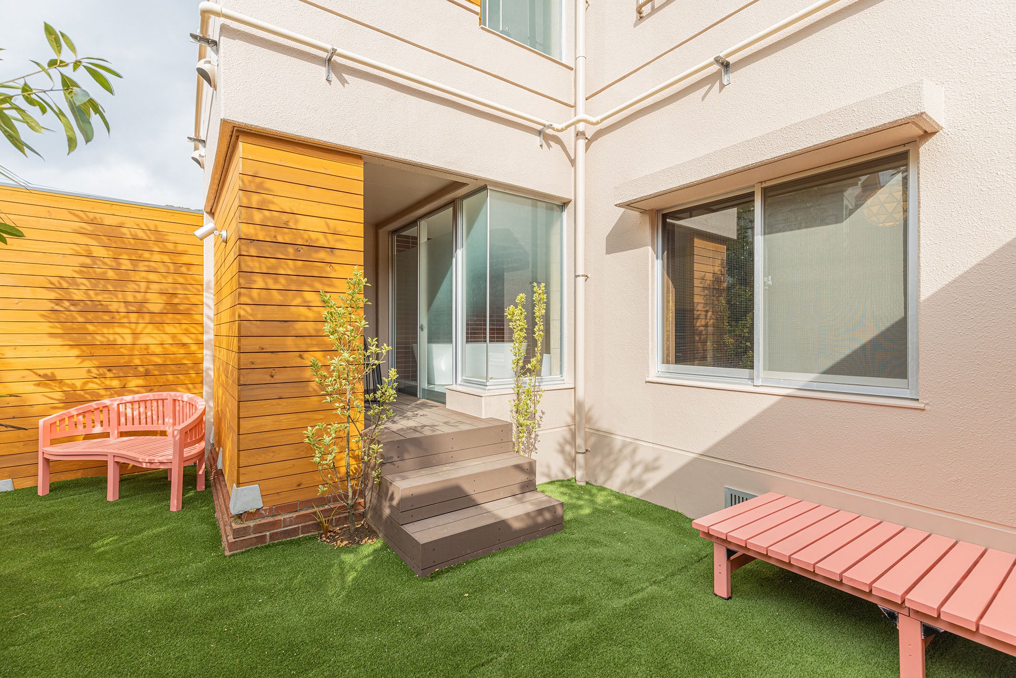 南房総の岩井海岸に寄り添って広がる広大な原生林の一角に、隠れるように佇む「DANQOO」は、客室わずか10室の海辺のヴィラ。館内は人と愛犬が同じ目線で愉しめるリゾートをテーマにしたレイアウトです。エントランス正面に現れる中庭テラスは、そんなおもてなしを象徴するアウトドアラウンジ。お好きなウェルカムドリンクで、まずはここから始まる素敵な旅時間にワンちゃんと一緒に、ちいさな乾杯を。テラス中央の焚火台には、日暮れとともにあかあかと焚火が灯ります。夜はお酒も楽しめるナイトラウンジとしてもご利用ください。