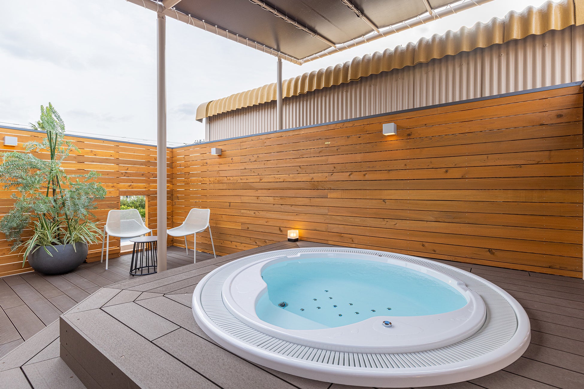 炎を見つめて過ごす寛ぎのナイトタイム間接照明が灯る夜の「DANQOO」は、賑やかだった一日と対象的な静けさに包まれる甘やかでラグジュアリーな大人の佇まい。パチパチとはぜる薪の香りに包まれた中庭の焚火テラスは、夜はお酒を片手にのんびりと映画鑑賞にひたるオープンシアターとしてもお楽しみいただけます。夜風が運ぶ心地よい潮の香りに包まれながらオーナー様同士、愛犬の傍らで静かな語らいに時を忘れる極上の夜をお過ごしください。