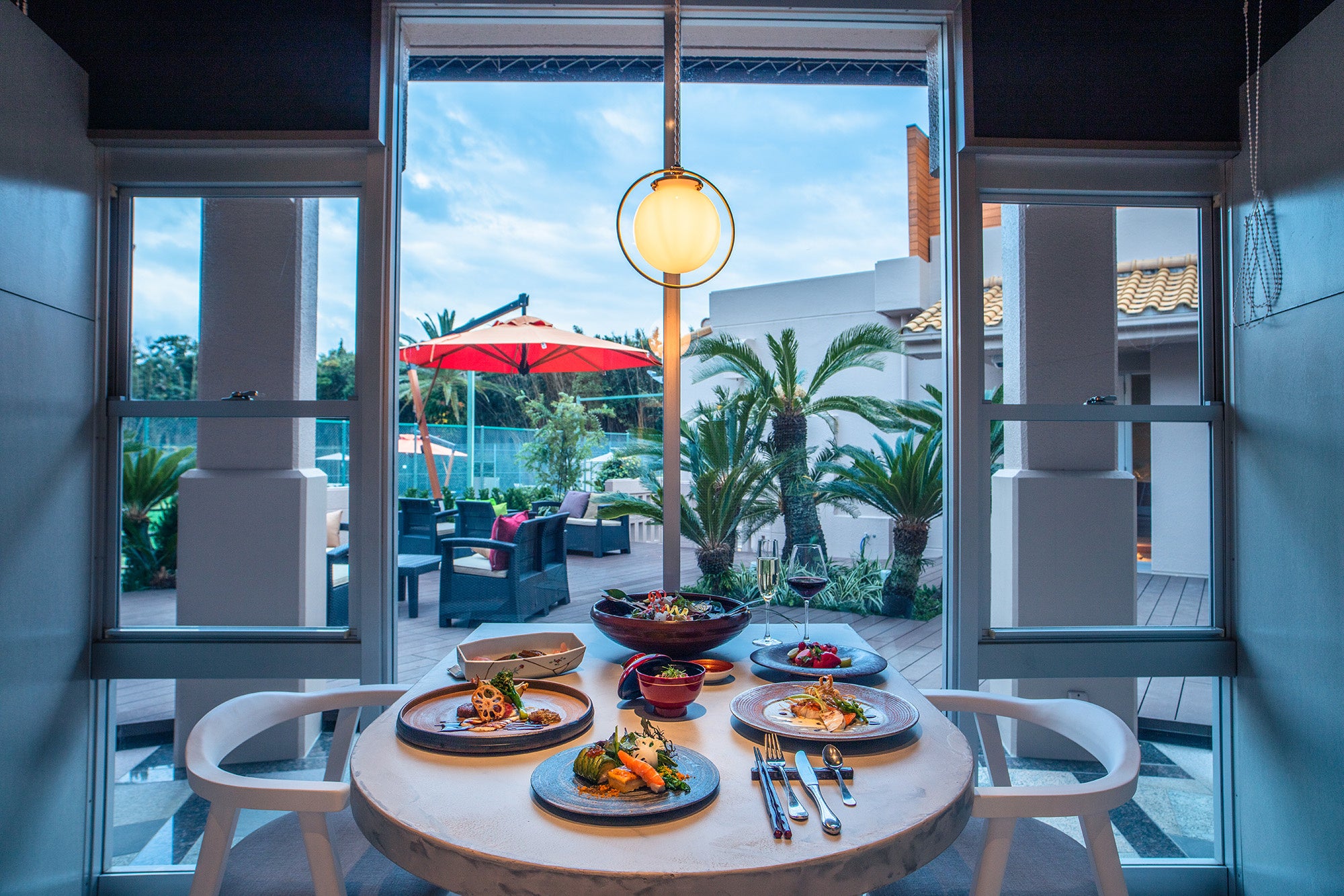 ご夕食は館内のレストランで個室スタイルでご用意いたします。一年を通じて温暖な房総は、食材の旬を先取りに楽しめる贅沢な土地柄。ここでしか味わうことのできない身土不二の美味をご堪能ください。土地毎に異なるテロワールの特徴を映すワインのように、物語のある房総のおいしさをお届けするのも「DANQOO」のこだわりです。ワンちゃんもオーナー様と一緒においしいひとときをお楽しみいただけるよう、体をいたわる特製のお食事をご用意いたします。