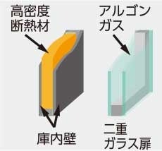 ■温度変化しにくいW保冷キープ構造(庫内壁は分厚い断熱材、アルゴンガスが間に入った扉二重ガラス)