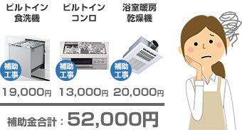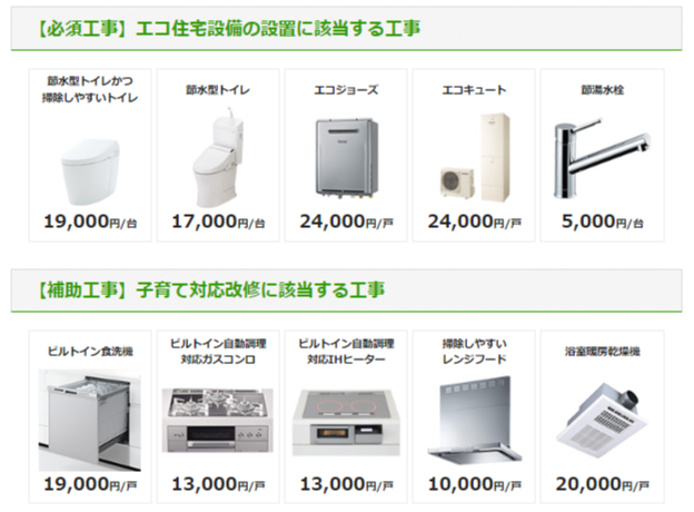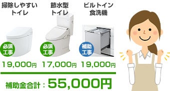 受け取れる補助金額は5万円が下限です。そのため、エコ商品とセットで時短アイテムの設置・交換が必要となります。