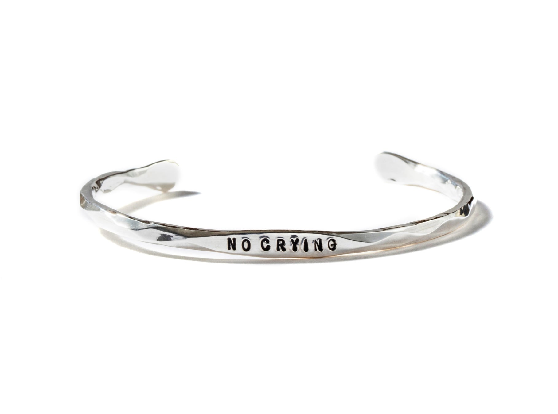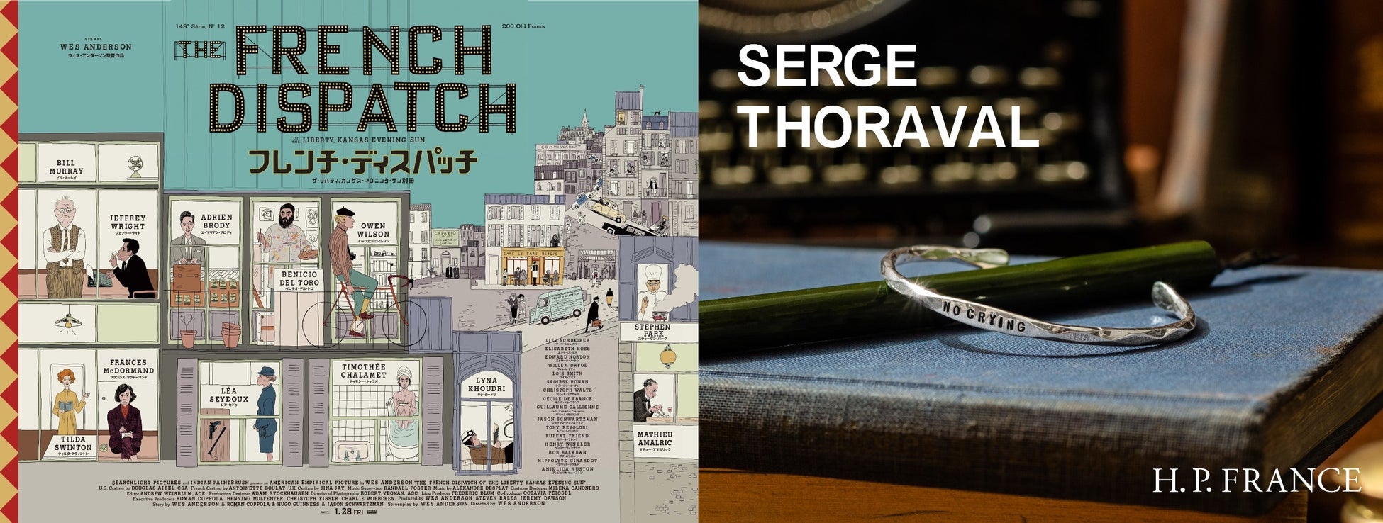 刻印されたメッセージを贈り、身に着けることでストーリーが生まれるジュエリー“セルジュ・トラヴァル”。映画『フレンチ・ディスパッチ』の「活字文化とフレンチ・カルチャーに対するラブレター」というコンセプトに共感し、インスパイアードジュエリーの制作をいたしました。バングルに刻印された「NO CRYING(泣くな)」は、編集長アーサー・ハウイッツァー・Jr.が編集部員に繰り返し掛けた言葉。ブランドの特徴であるスターリングシルバーの無骨な曲線美に、編集長の言葉のように力強い刻印を施しました。2022年1月14日(金)より、全国のお取扱い店舗及びオンラインストアにて、50点の数量限定で販売を開始します。