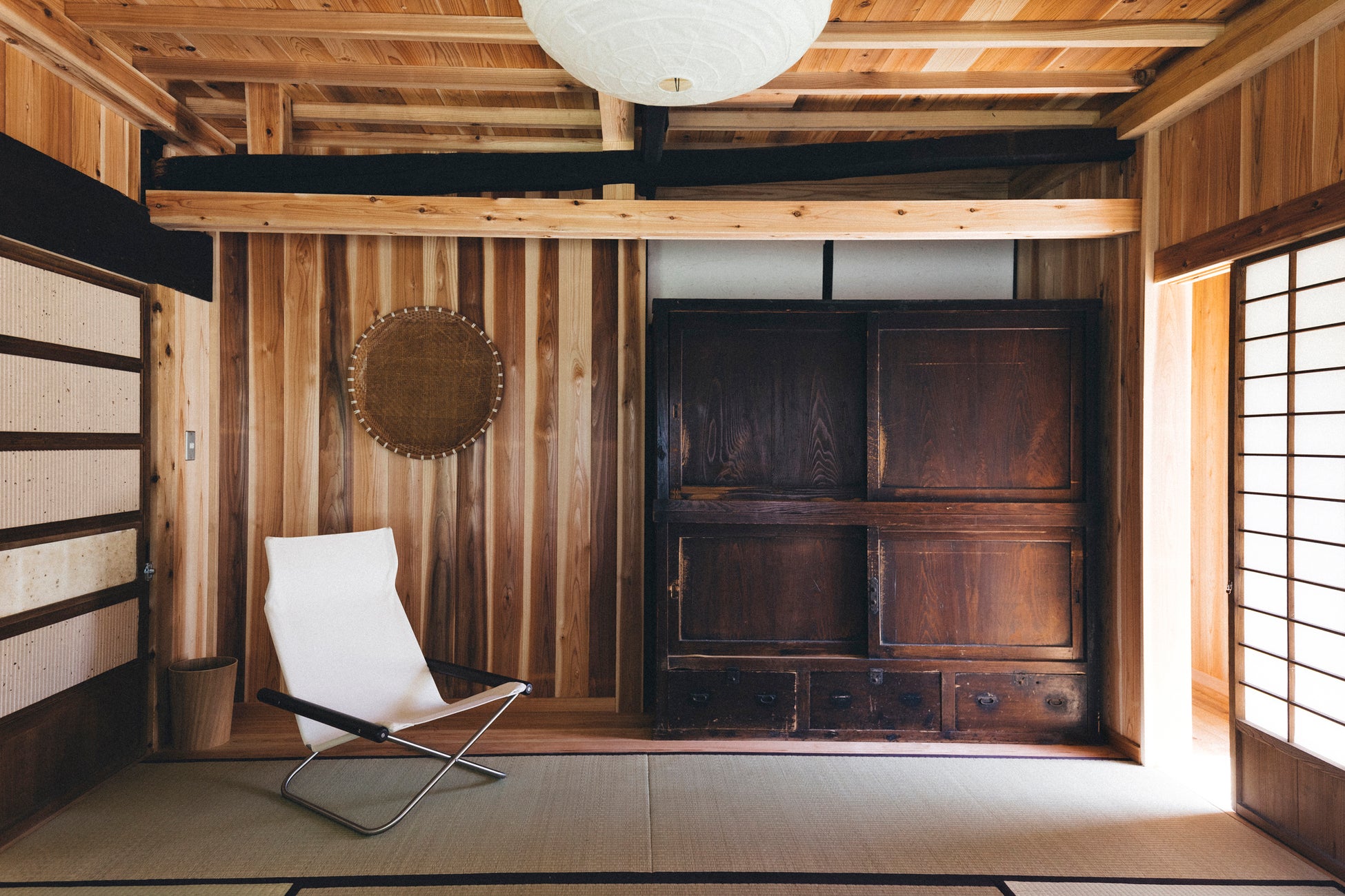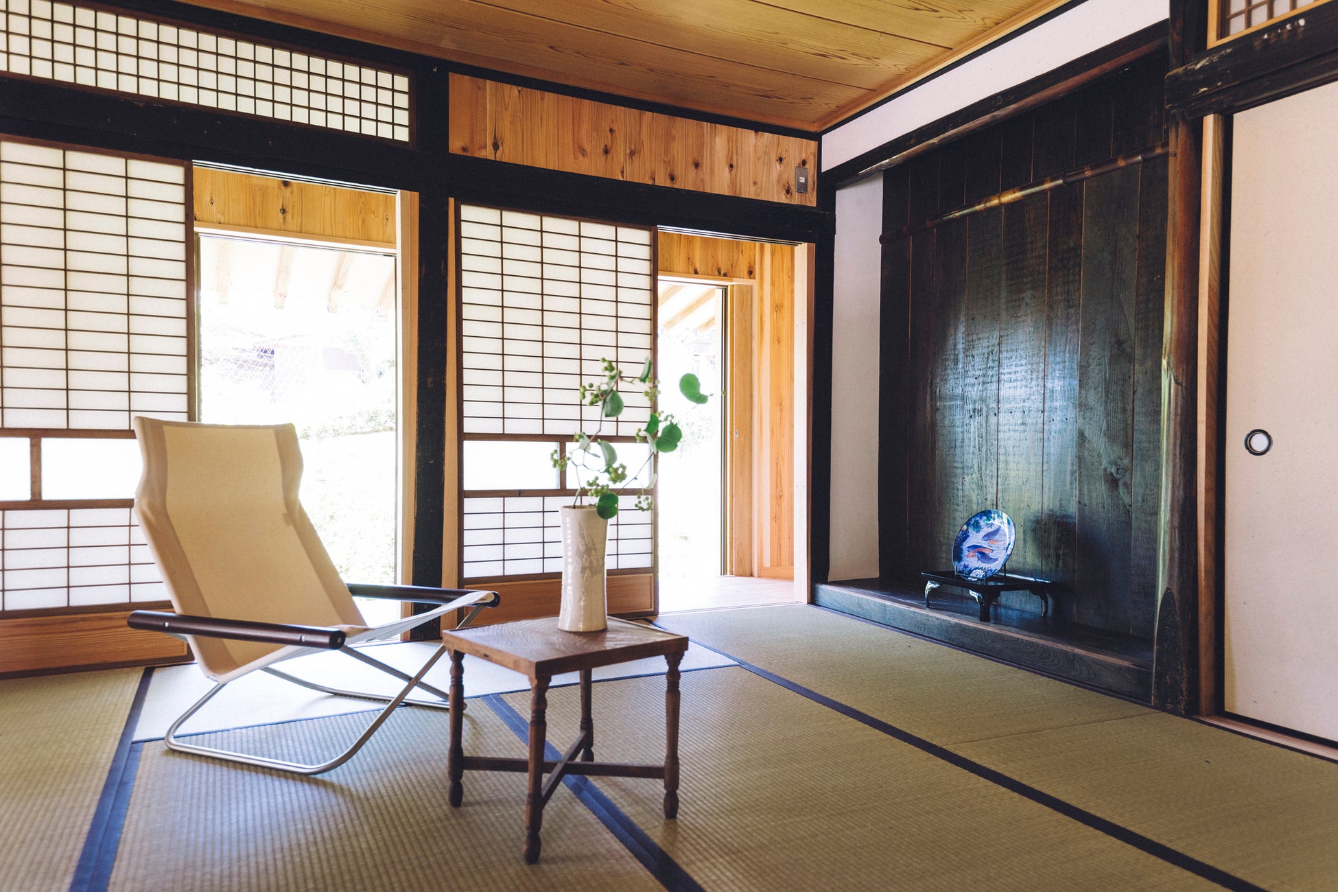 もともとの梁や建具を生かした、木の温もりある和の空間。造り酒屋時代に使われていた看板や瓶なども一部再利用して飾り、訪れた方に家の歴史を感じてもらえるよう工夫しています。客室は、畳のお部屋と板間をご用意しております。ご家族やご友人、お仕事仲間との一棟貸し切りでのご利用も可能です。