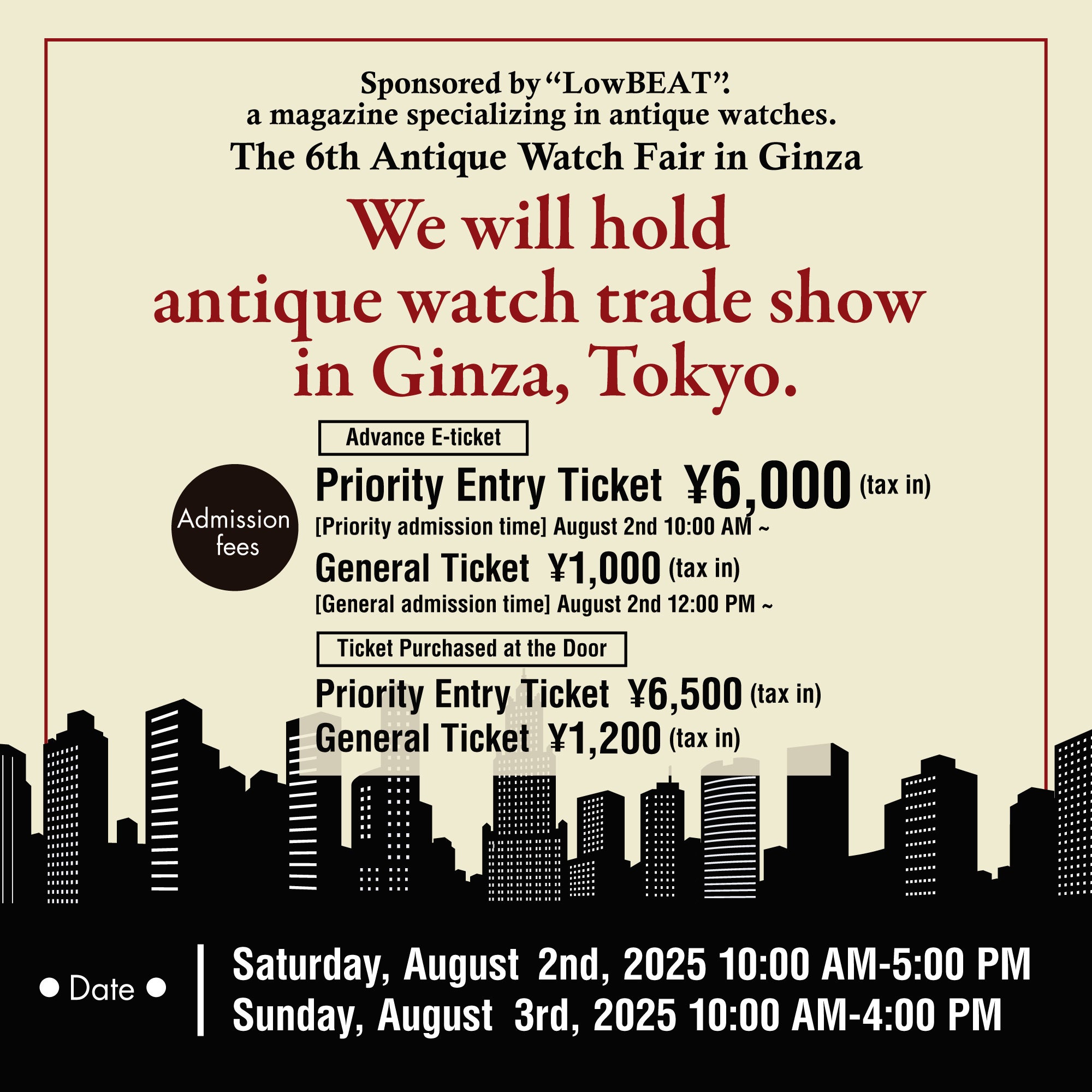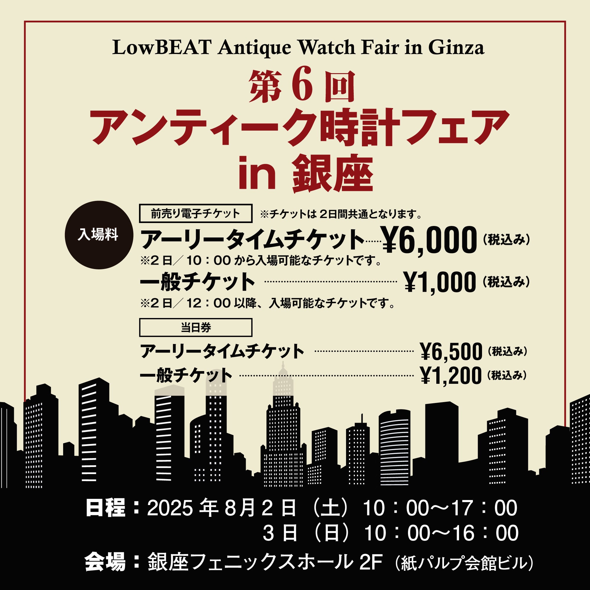 時計関連の雑誌、MOOKの出版および時計ニュースサイトの運営を行う株式会社シーズ・ファクトリー(所在地:東京都港区、代表取締役:菊地吉正)が発行する、業界唯一のアンティークウオッチ専門誌「LowBEAT(ロービート)」では、アンティーク時計の魅力をよりリアルに体験していただくことを目的にした販売イベントの第6回目を、2025年8月2日(土)・3日(日)の2日間の日程で開催します。