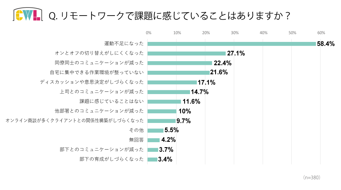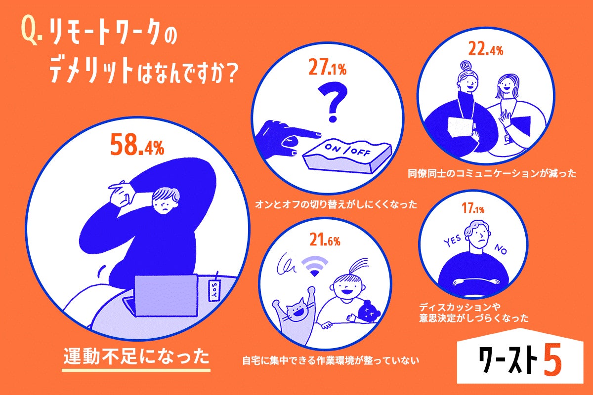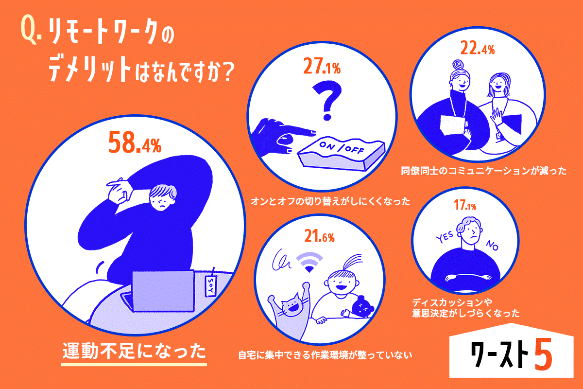 - リモートワークのデメリット、トップはダントツの「運動不足」が58.4%