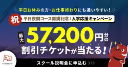 平日夜間コース開講を記念し、最大57,200円の割引チケットがあたるキャンペーン開催中!