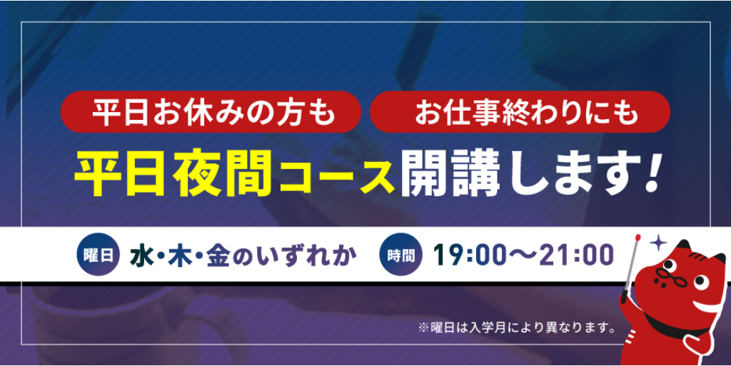 この度、「せっかく対面授業があるのに土曜日は仕事で通えない」「平日の仕事終わりの方が通いやすい」などのご要望を受け、【平日夜間コース】の開講が決定しました!