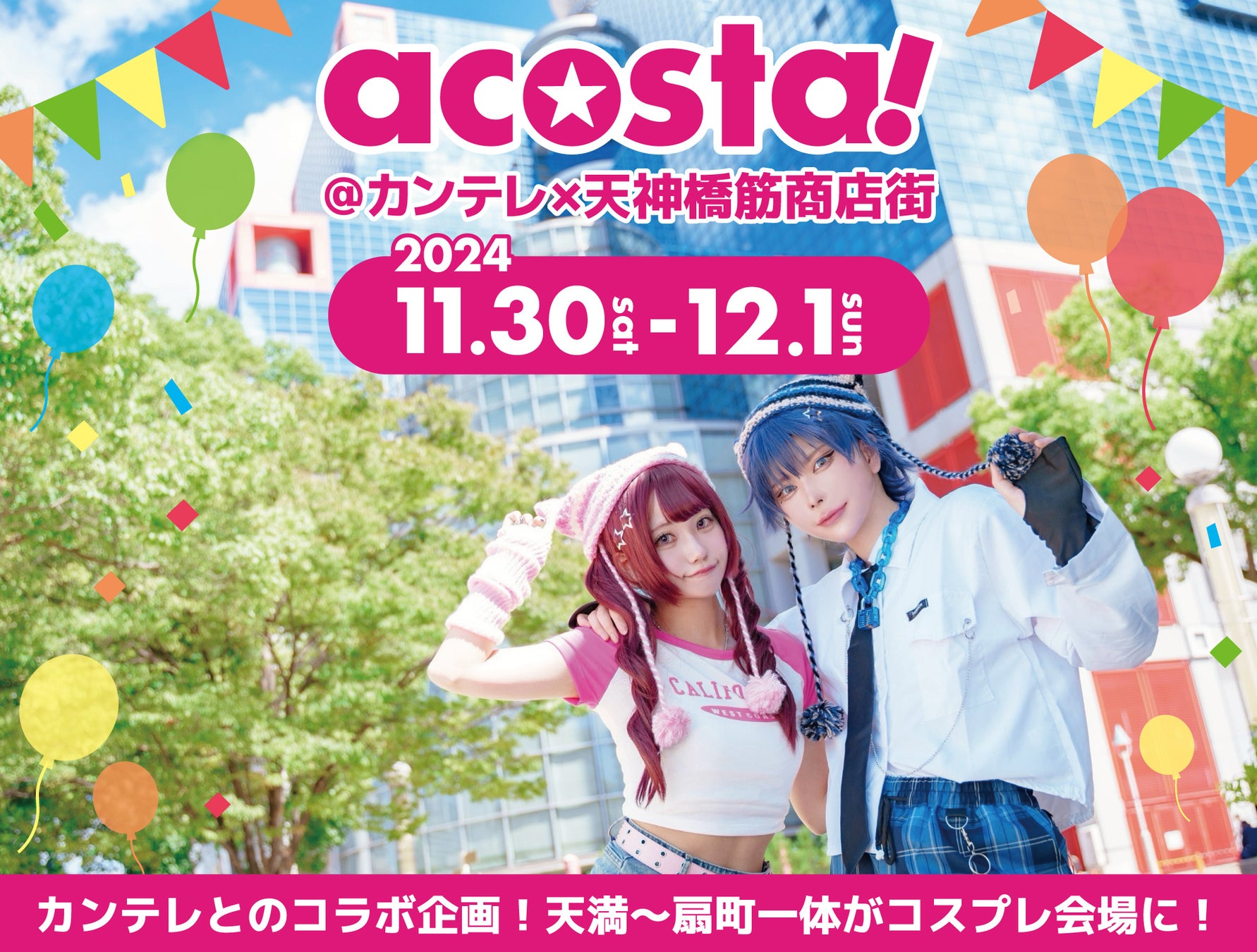 日本全国でコスプレイベントを運営する株式会社ハコスタ(本社:大阪市、代表取締役:松村 良洋)は、関西テレビ放送株式会社(本社:大阪市、代表取締役社長:大多 亮)とぴあ株式会社との共催として、2024年11月30日(土)・12月1日(日)の2日間、コスプレイベント「acosta!@カンテレ✕天神橋筋商店街」をカンテレ扇町スクエアをはじめ天満から扇町一帯を会場に初開催します。