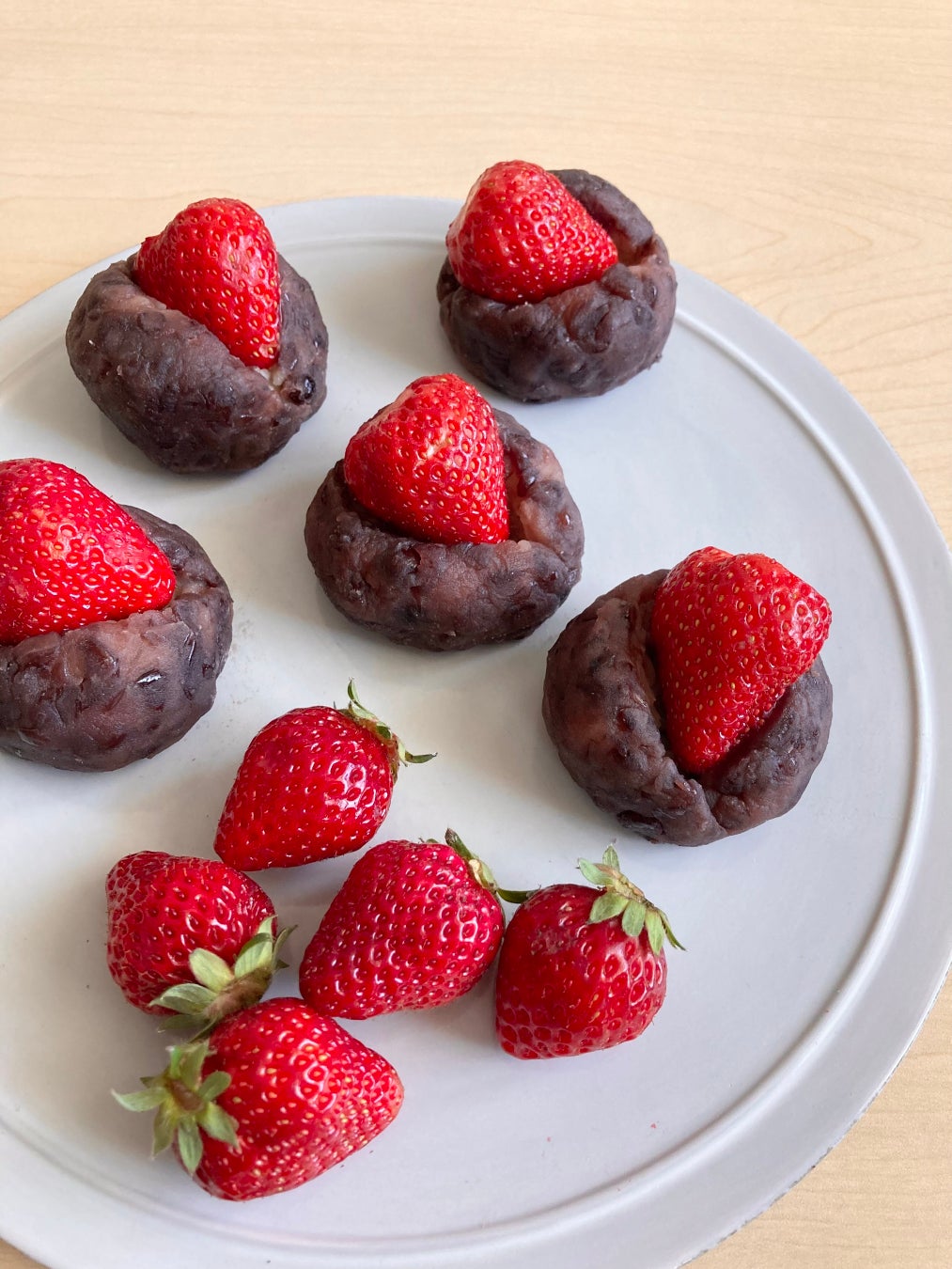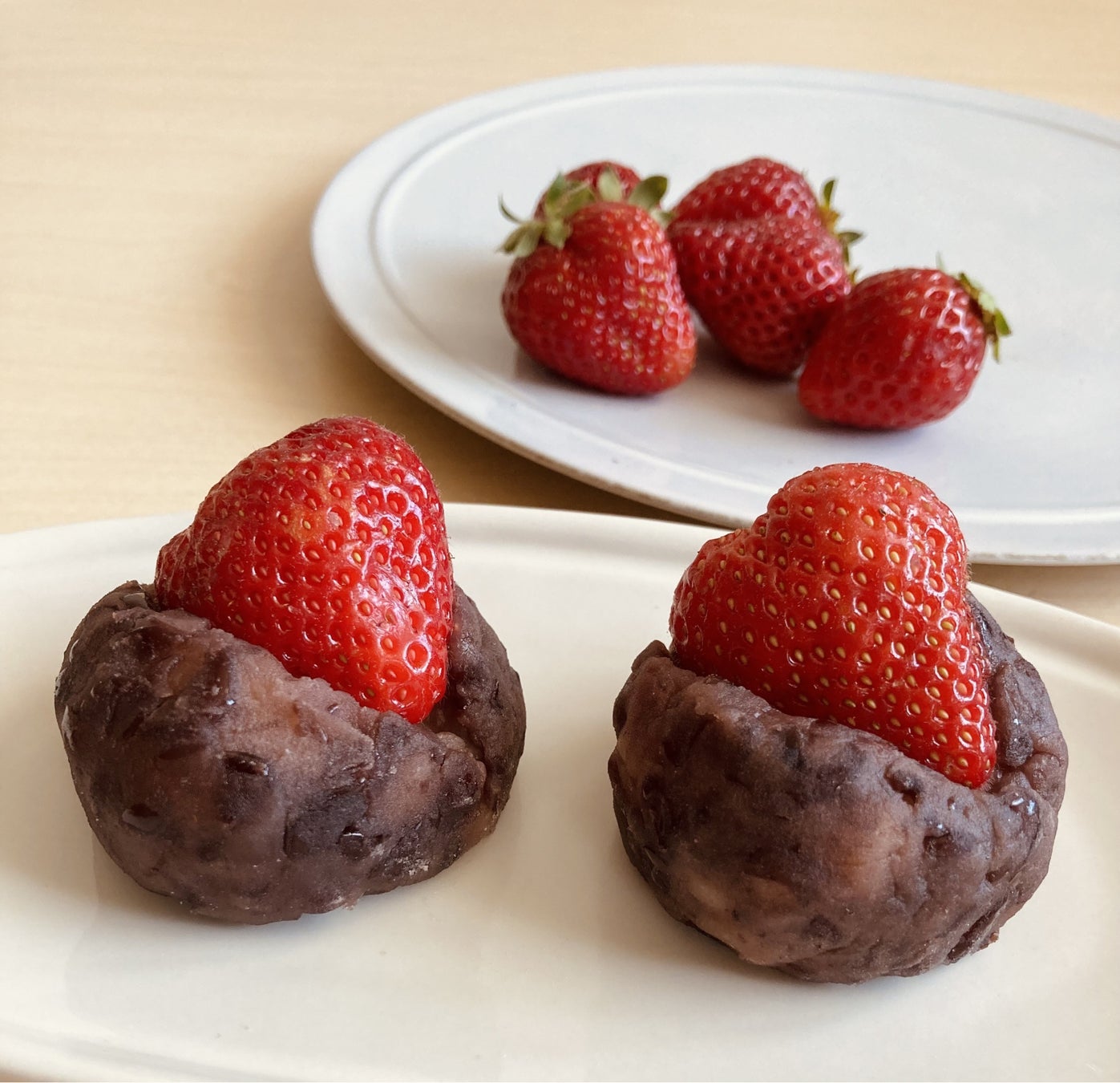 兵庫県産もち麦を使用した粒あんのおはぎに神戸の苺をトッピング