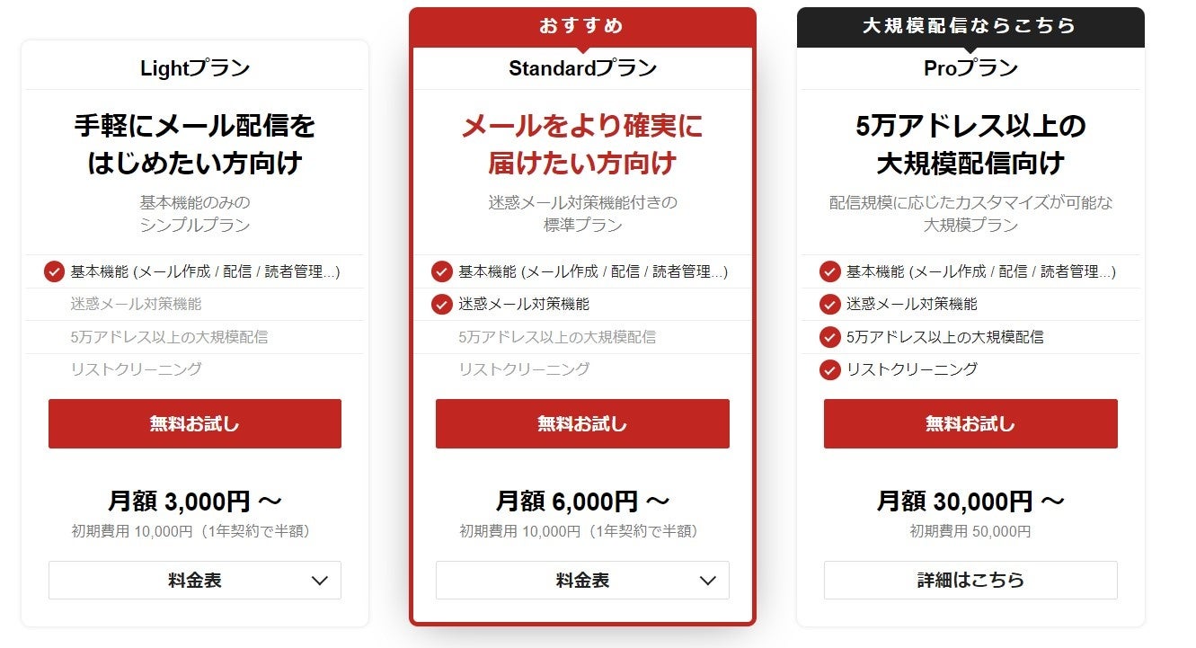 メール配信が初めての方でも使いやすい、シンプルな設計を特長としており、ニーズに合わせて選べる豊富なプランが月額3,000円(税別)からというリーズナブルな価格で利用できる点も魅力のひとつです。