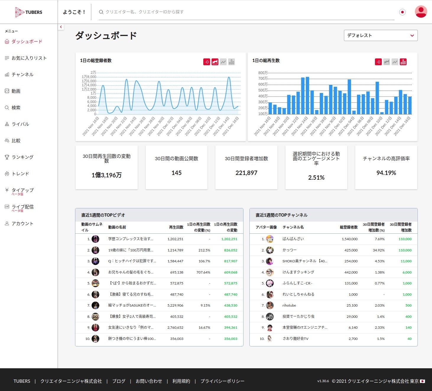 さらに、TUBERSダッシュボードには、複数のチャンネル・動画の動向をまとめて閲覧できるリスト機能や自身のチャンネルと近しいチャンネルを教えてくれるライバル機能、チャンネルのアナリティクスを表示する比較機能、製品や広告主ごとに動画を確認できるタイアップ機能、頻繁に使われているタグの検索機能などが実装されています。